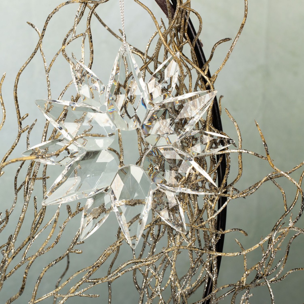 Conseil d'aménagement : Placer d'abord l'anneau métallique dans le plateau, puis le remplir de mousse naturelle. Les branches sont enroulées autour de l'anneau et décorées avec les étoiles en acrylique. Les bougies sont placées de manière symétrique devant la composition, car elles sont l'élément principal de ce look.