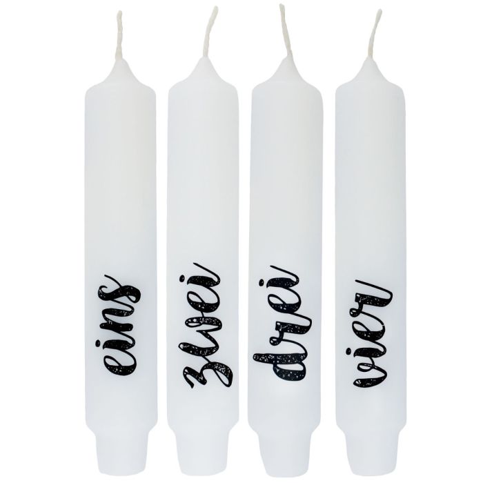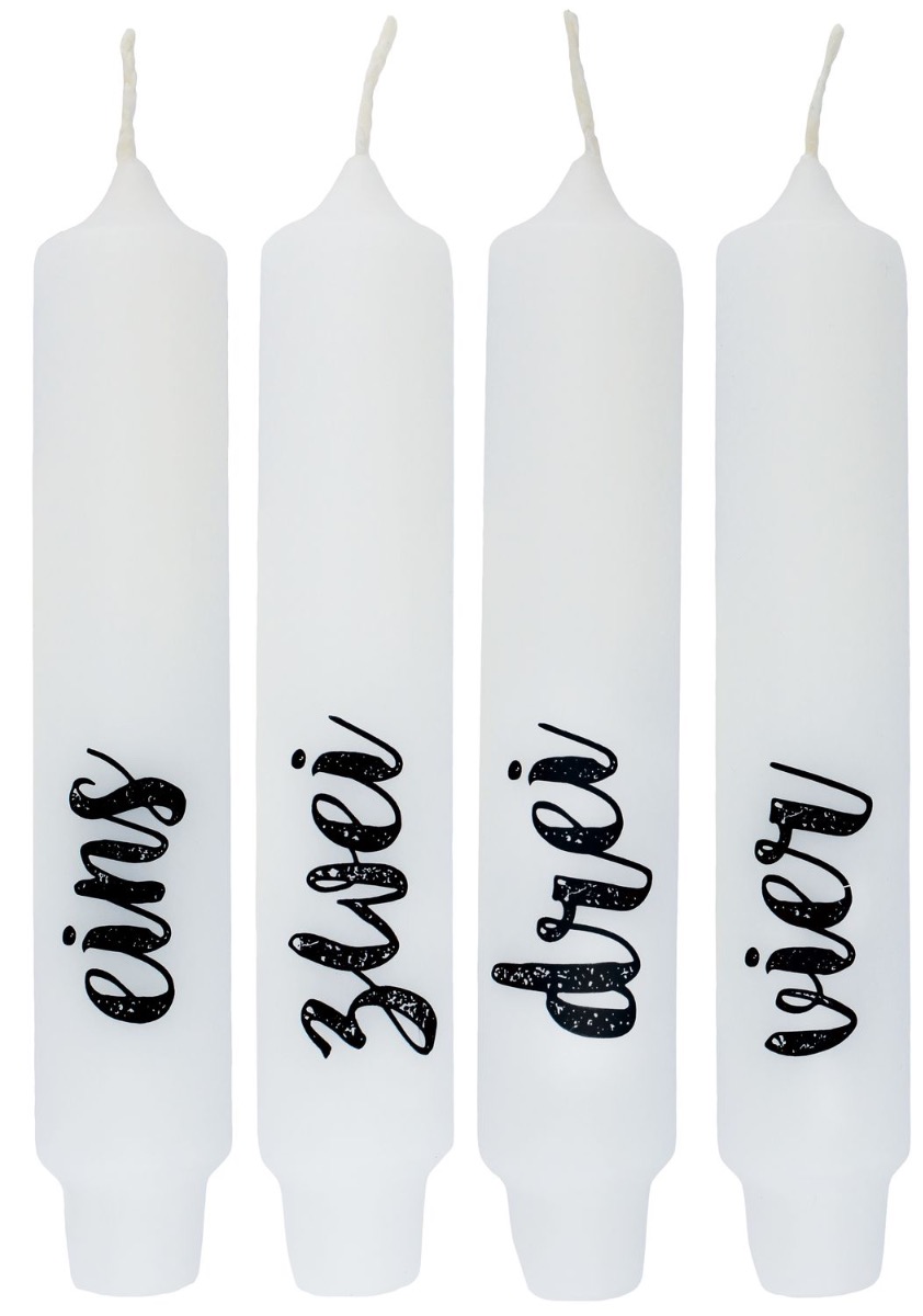 - En blanc avec écriture noire, en tout 4 bougies avec différents slogans en allemand