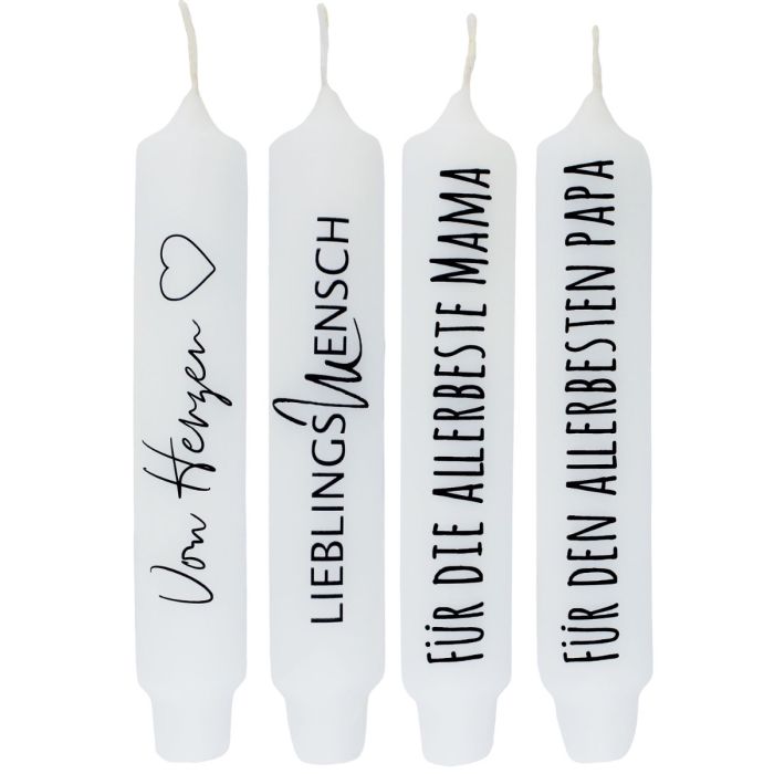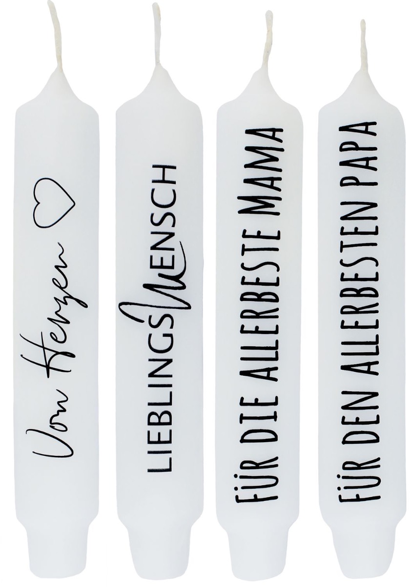 Bougie candelle avec dicton KELANI, cordialité en allemand, 4 bougies, 4 dictons, multicolore, 16,5cm, Ø2,8cm, 6h