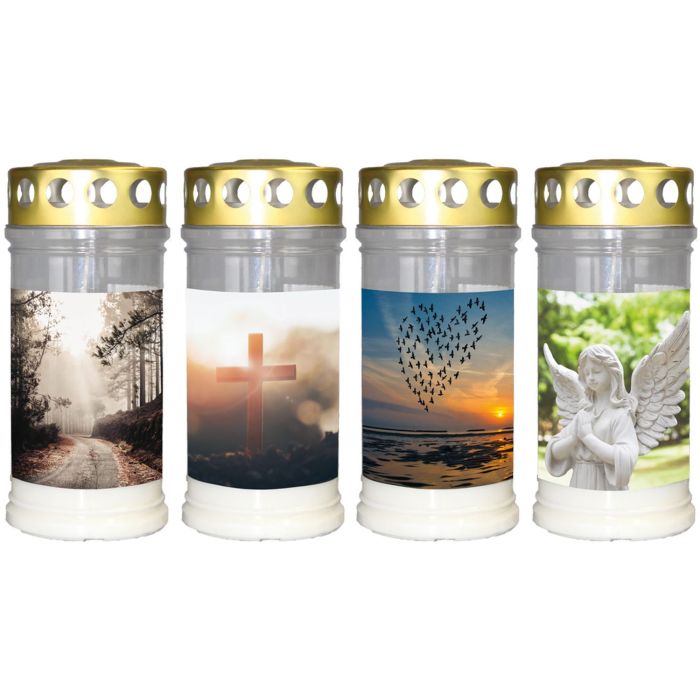 Bougie funéraire SAVINA avec motif, couvercle, 4 pièces, blanc, 17cm, Ø7,7cm, 96h