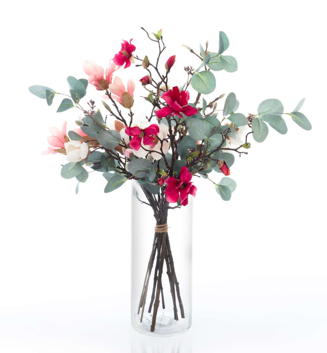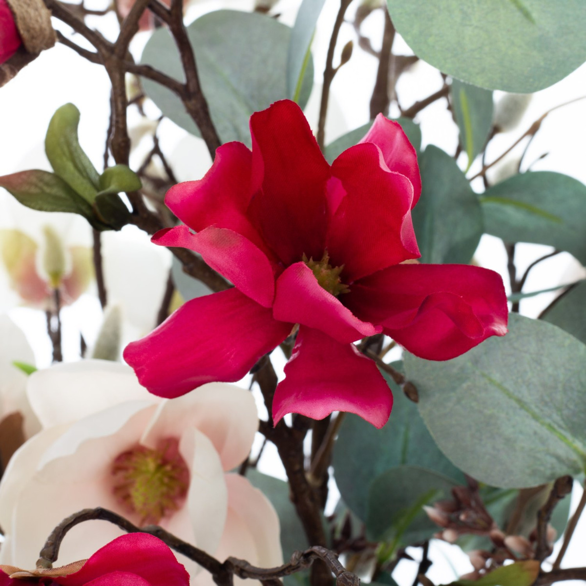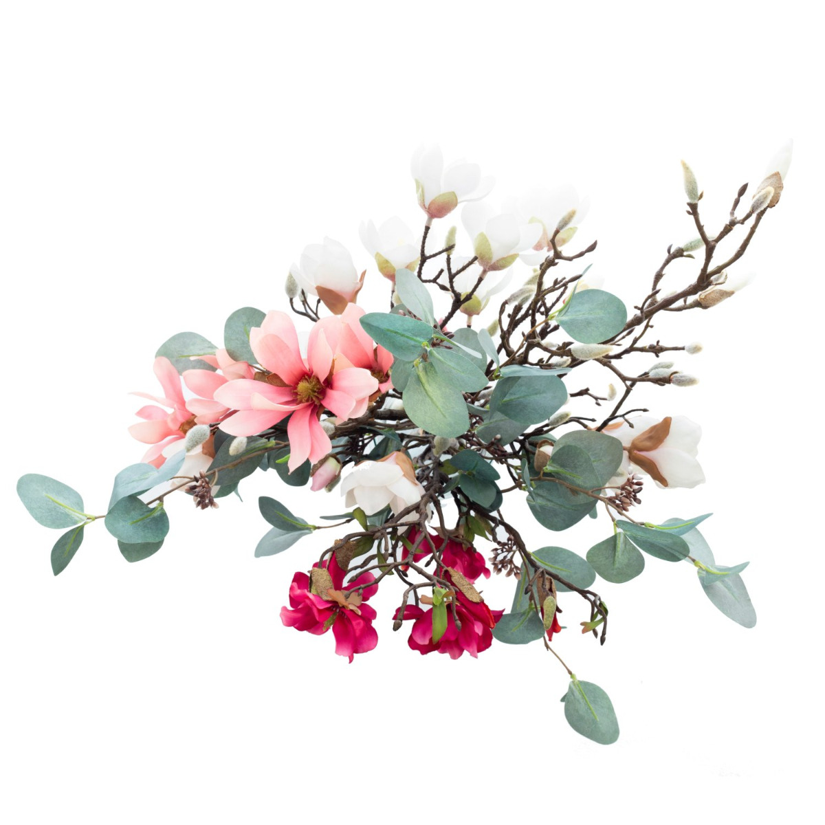Accueillez le printemps avec notre bouquet de fleurs de magnolia MERISA. Le bouquet se compose d'une grande branche de bourgeons et de branches de magnolias et de magnolias étoilé de différentes couleurs. L'abondance de fleurs est égayée par de grandes feuilles d'eucalyptus.