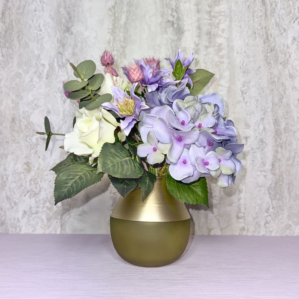 L'amour fleurit pour toujours ! En parcourant notre boutique en ligne, notre cliente habituelle Monika est tombée sur un ancien projet de bouquet de mariée. Elle s'est demandé s'il était possible de reproduire son propre bouquet de mariage et nous a écrit un message. Le bouquet devait être une surprise inoubliable pour sa femme, qui lui rappellerait le jour de leur mariage. Une belle déclaration d'amour, selon nous. Le bouquet est composé d'un hortensia luxuriant d'un lilas délicat et de roses de couleur crème. Ces fleurs ont été complétées par de fines clématites et un feuillage vert de branches de pommier et d'eucalyptus. Pour la première fois, nous avons également utilisé des fleurs séchées qui ont apporté des touches de couleur entre les pétales de roses. Notre cliente était très contente de notre bouquet de mariée. Vous aussi, vous aimeriez un bouquet de mariage artificiel pour l'éternité ? Shop the Look!