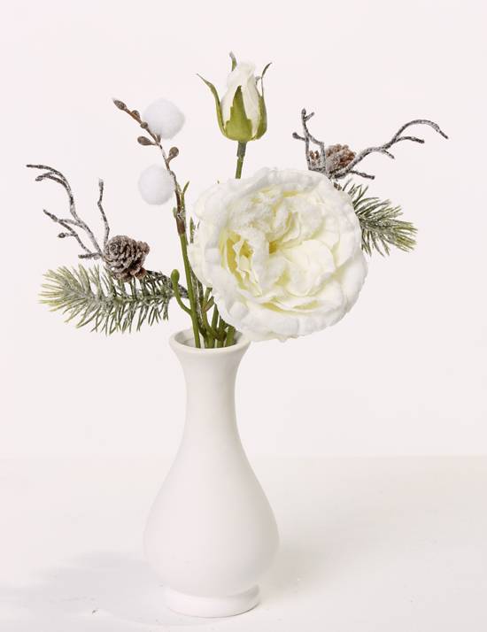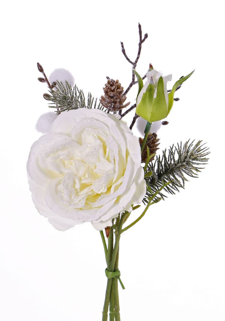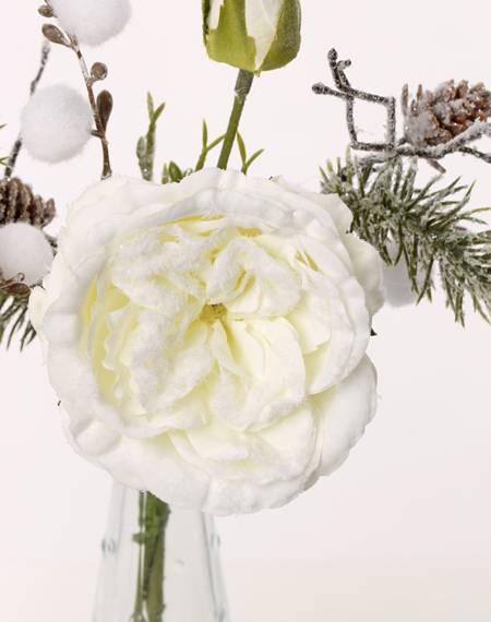 Bouquet de roses artificielles FANNI, pommes de pin, neige, blanc, 30cm, Ø15cm