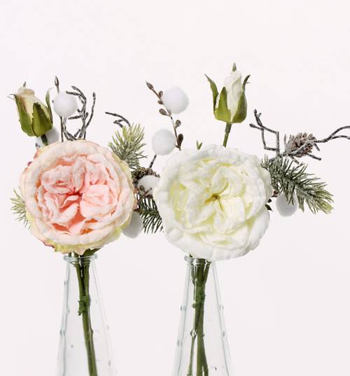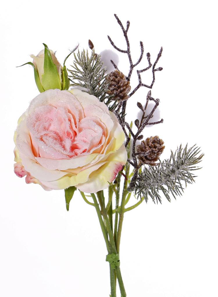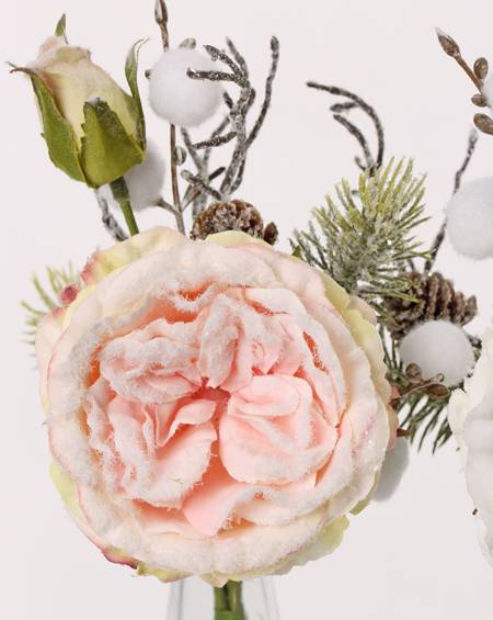 Bouquet de roses artificielles FANNI, pommes de pin, neige, rose, 30cm, Ø15cm