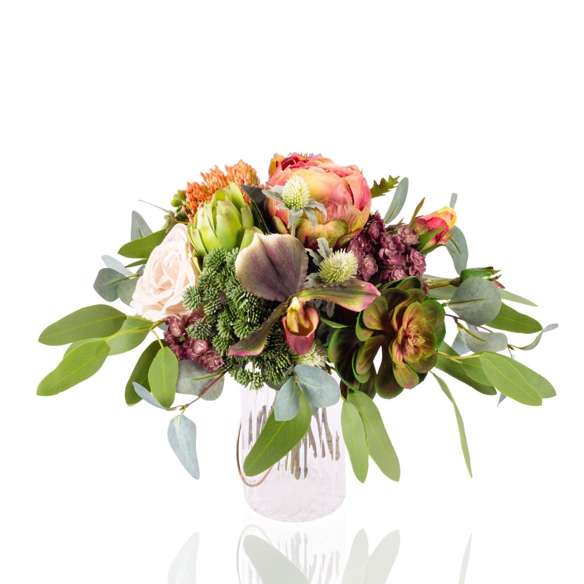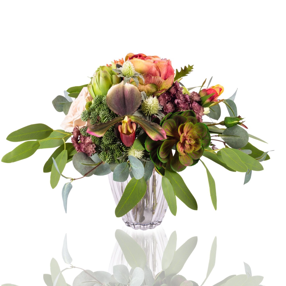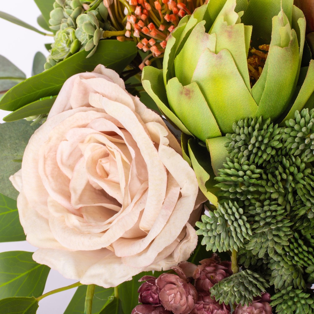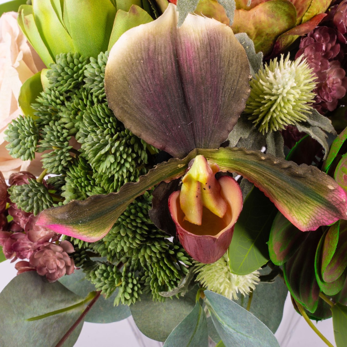 - Faux bouquet NABINTY composé de produits suivants ou au moins équivalents : diverses plantes succulentes (echeveria, sedum), orchidée sabot de Vénus exceptionnelle, protéa et artichaut imposants, roses charmantes, eryngiums épineux et eucalyptus comme accessoires