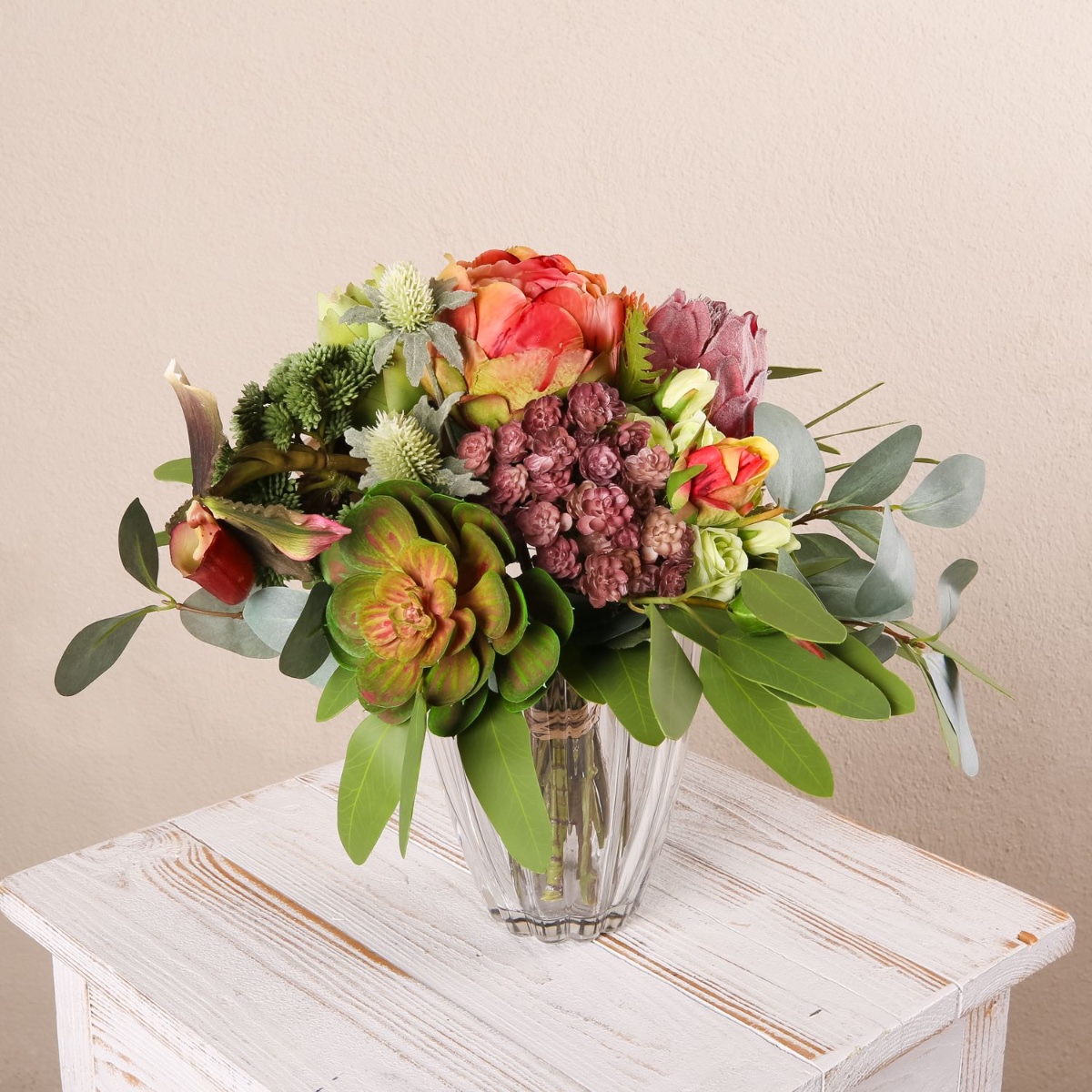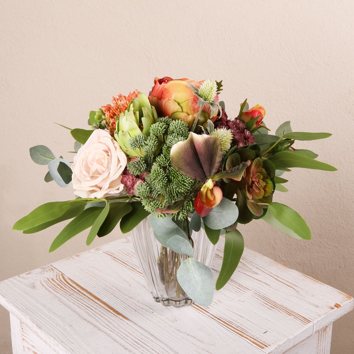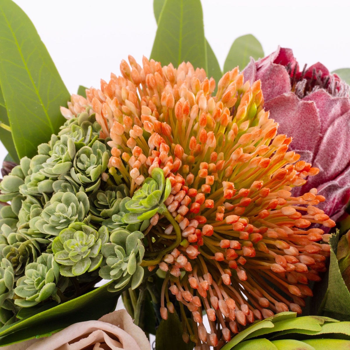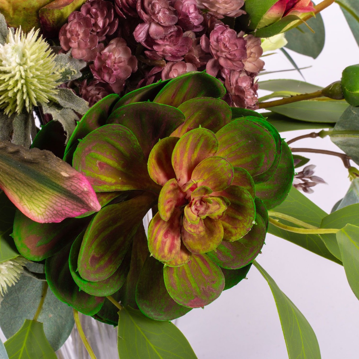 - Faux bouquet NABINTY composé de produits suivants ou au moins équivalents : diverses plantes succulentes (echeveria, sedum), orchidée sabot de Vénus exceptionnelle, protéa et artichaut imposants, roses charmantes, eryngiums épineux et eucalyptus comme accessoires