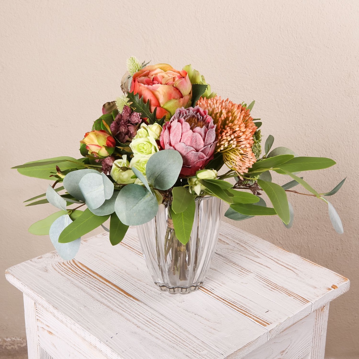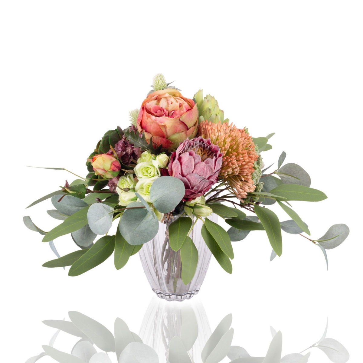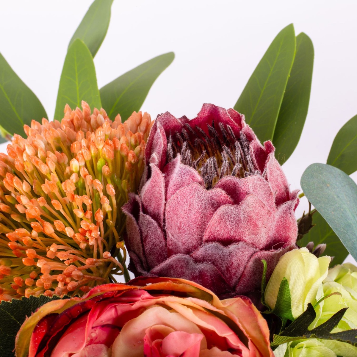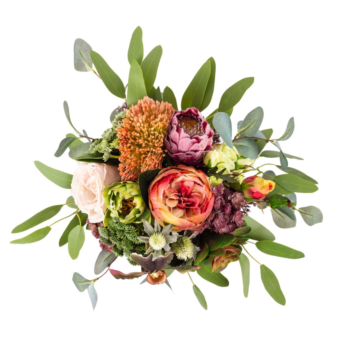 - Faux bouquet NABINTY composé de produits suivants ou au moins équivalents : diverses plantes succulentes (echeveria, sedum), orchidée sabot de Vénus exceptionnelle, protéa et artichaut imposants, roses charmantes, eryngiums épineux et eucalyptus comme accessoires