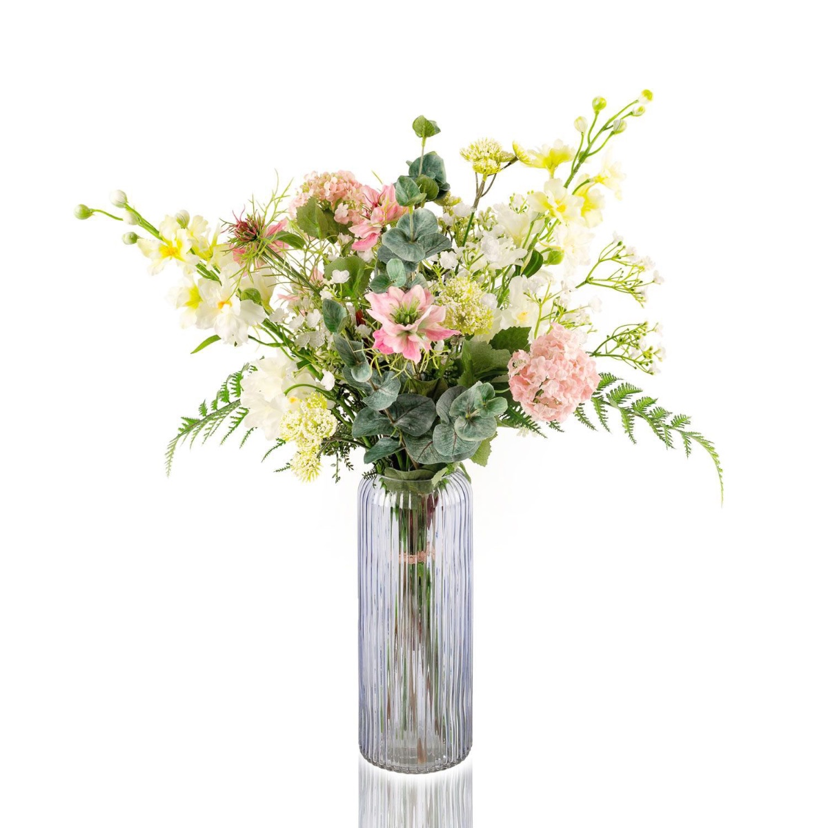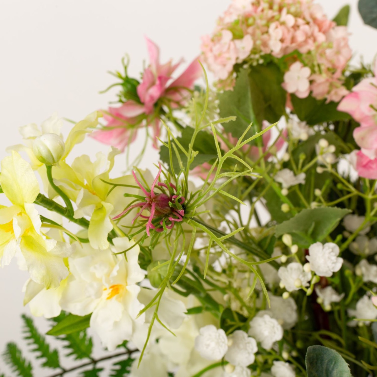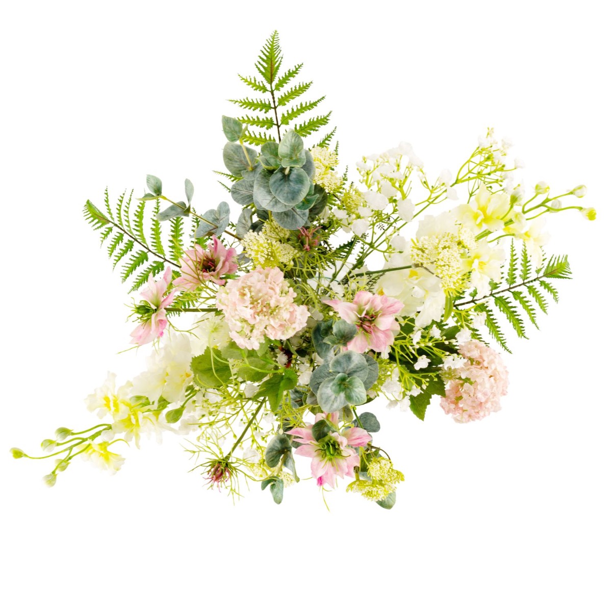 - Arrangement floral artificiel lié à la main, composé de delphinium, viorne, nigelle, achillée, gypsophile, eucalyptus et fougère royale de couleur rose-blanc-vert