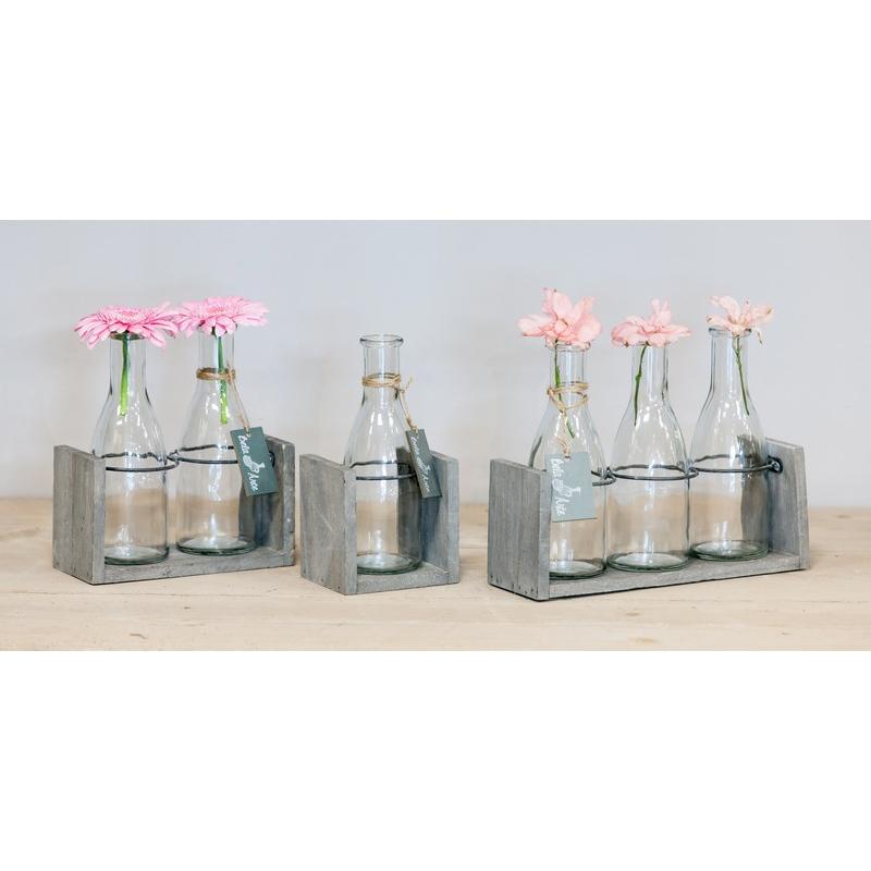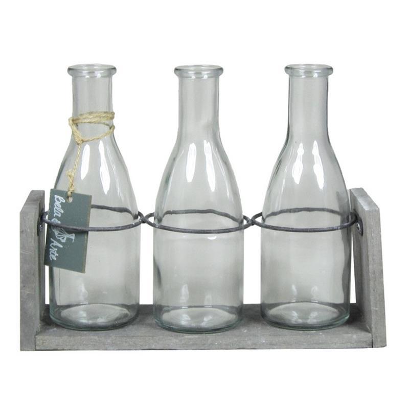 Bouteilles en verre ANYA avec support en bois, 3 verres, transparent, 25x8x20cm