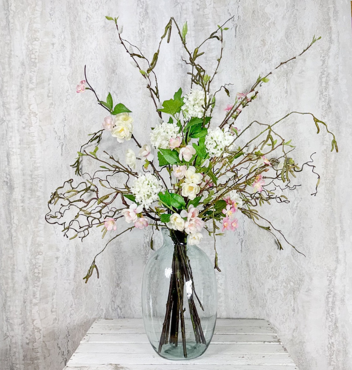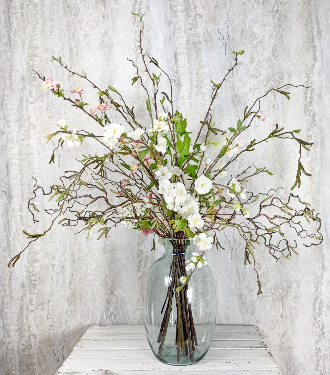 Wild and flowery! Pour son atelier, dans lequel ont lieu régulièrement des ateliers de création de bijoux, Christiane cherchait encore la décoration florale adéquate. Il était particulièrement important pour elle que des branches à longues tiges ainsi que des fleurs délicates créent un aspect sauvage et naturel. C'est ainsi que des chatons de saule, des noisetiers, des bouleaux, des branches de pommier, de pêcher et des fleurs de cerisier ont été utilisés. Une branche de boule de neige luxuriante a complété l'ensemble floral. Le bouquet est artistiquement arrangé, les branches s'entrelaçant dans une danse harmonieuse. Certaines branches s'inclinent élégamment vers le bas, tandis que d'autres s'élancent fièrement vers le ciel, mais ensemble, elles forment une composition équilibrée et esthétiquement agréable. Aimeriez-vous, vous aussi, posséder un joli objet déco qui incarne la beauté du printemps dans toute sa splendeur et qui remplit de joie le cœur de ceux qui le regardent ? Shop the Look!