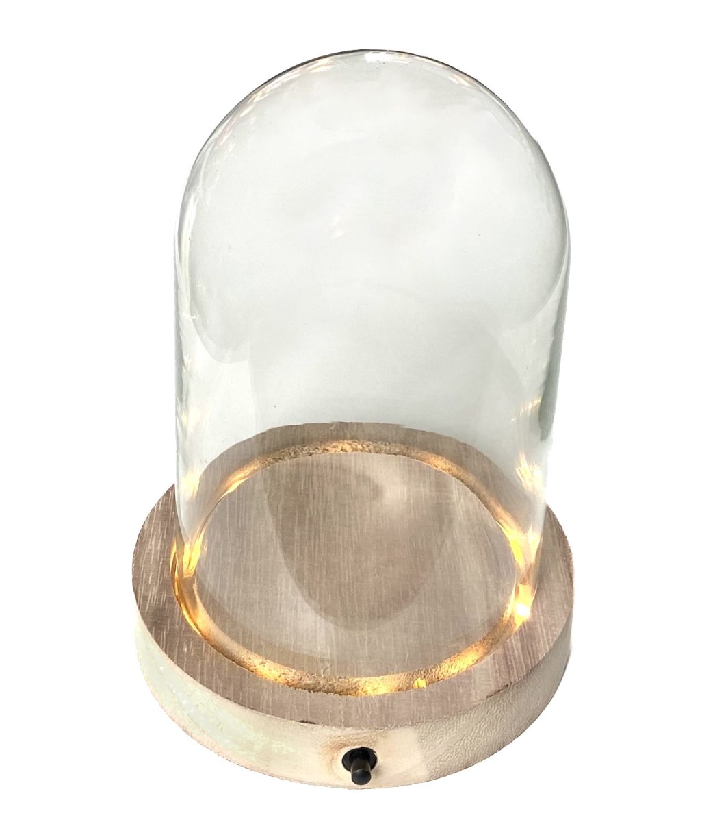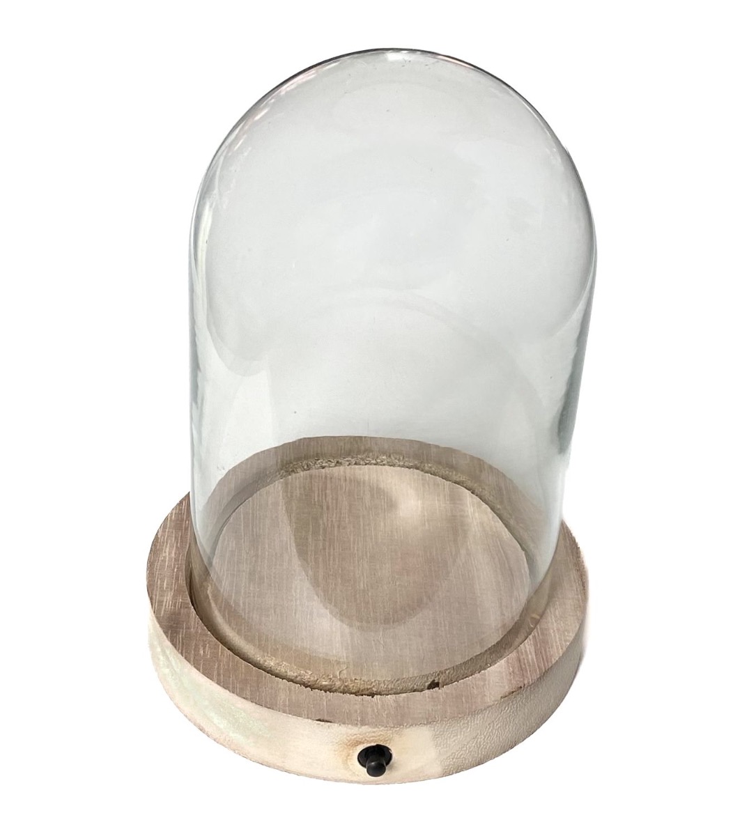 Cloche en verre BENIGNA avec LEDs, fond en bois, transparent, 16,5cm, Ø12cm