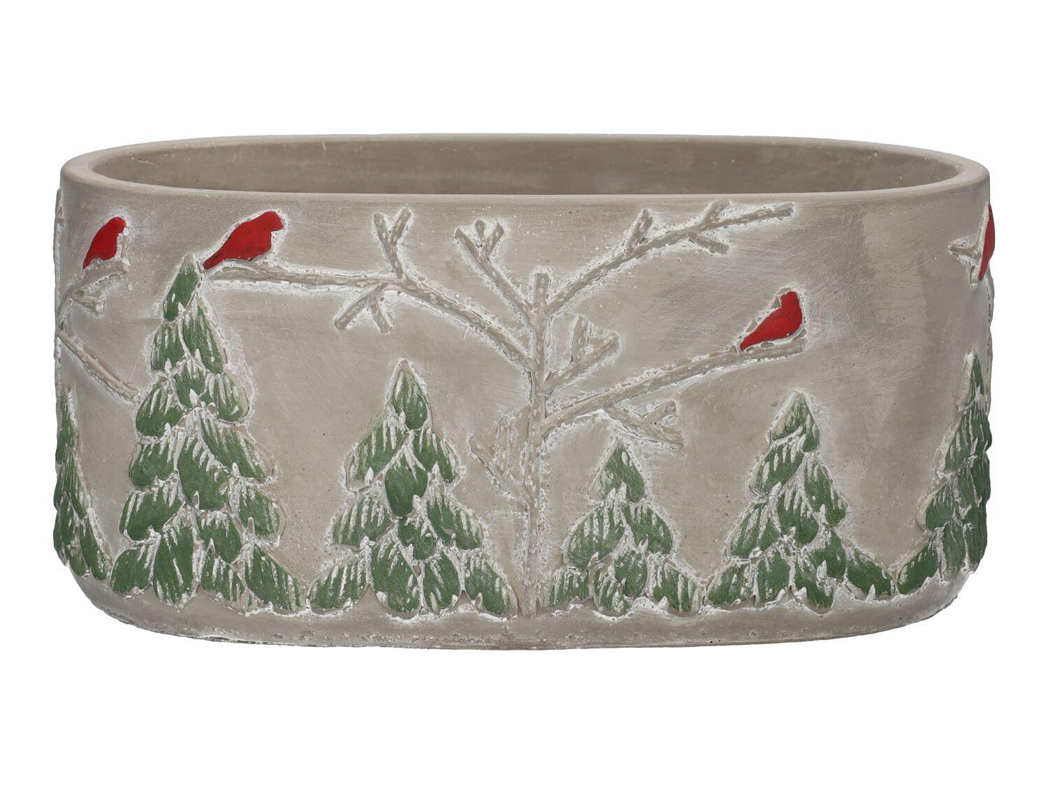 Coupe à fleurs ovale MILKE en béton, motif d'oiseaux hivernal, gris-rouge-vert, 20,5x11,8x10cm