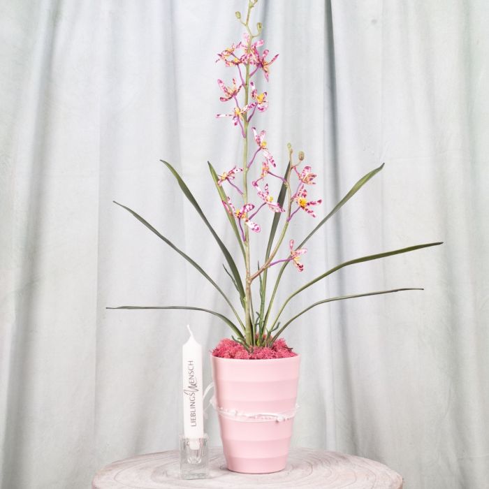 Délicates et discrètes! Les orchidées font partie des plantes les plus belles et les plus appréciées au monde. Que ce soit comme cadeau pour soi-même ou pour une personne spéciale. Cette plante a tellement de significations qu'elle convient vraiment toujours. À l'origine, l'orchidée était un symbole de virilité et de fertilité en raison de la forme de ses racines. Plus tard, elle a été utilisée pour symboliser l'élégance, la grâce et la délicatesse. Mais en même temps, elle est un symbole de sensualité, de passion et de beauté. Le rose des fleurs et du cache-pot souligne ces déclarations et crée des sentiments positifs. Un beau message dont chaque femme se réjouit ! Ce look est une tentative discrète de déclarer sa flamme à une personne adorée. Shop the Look!