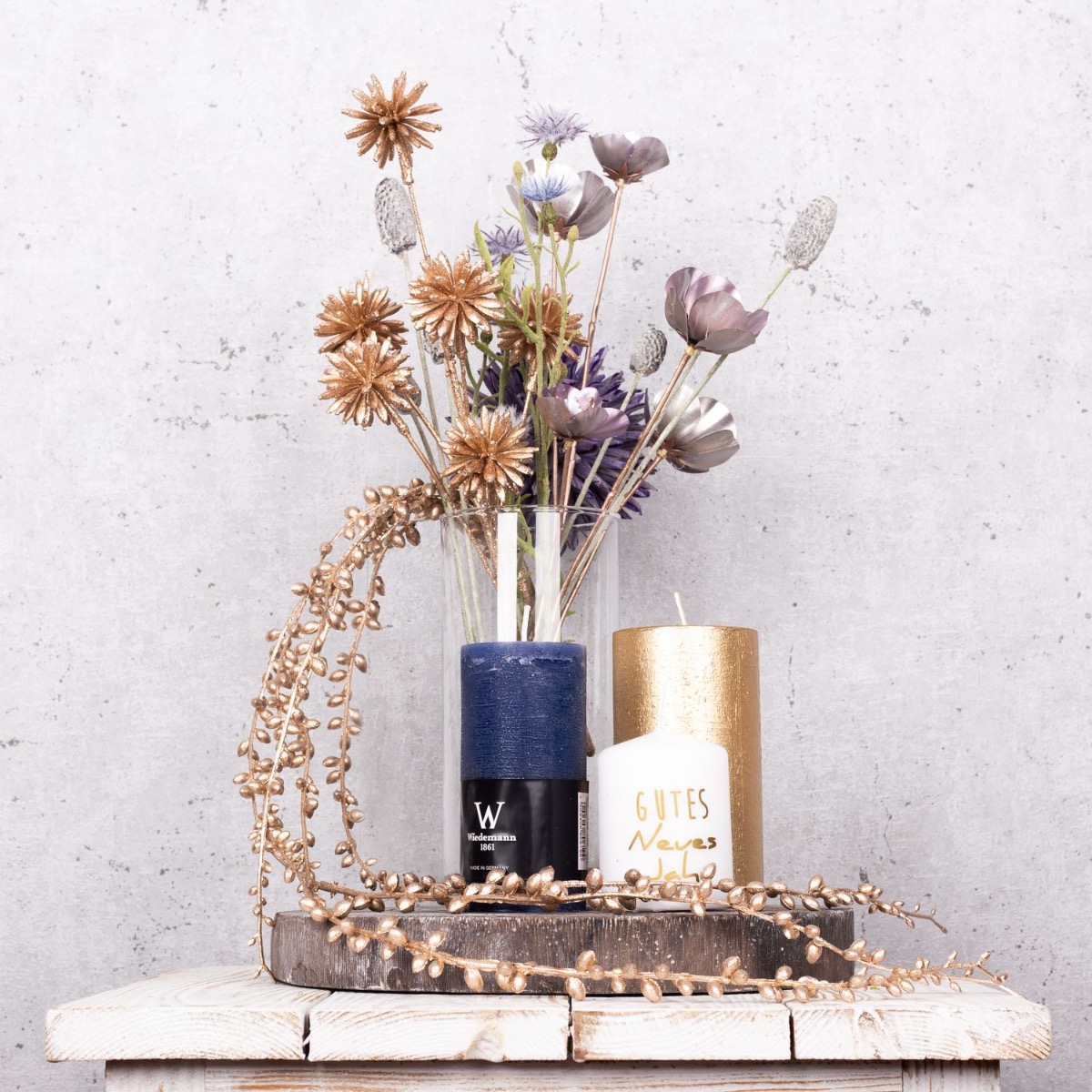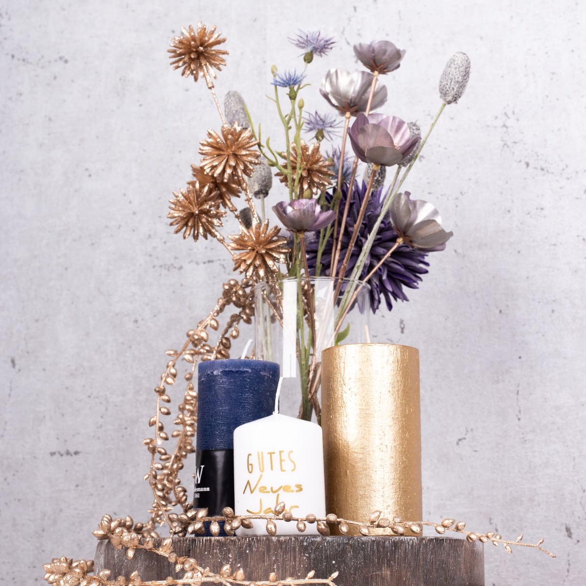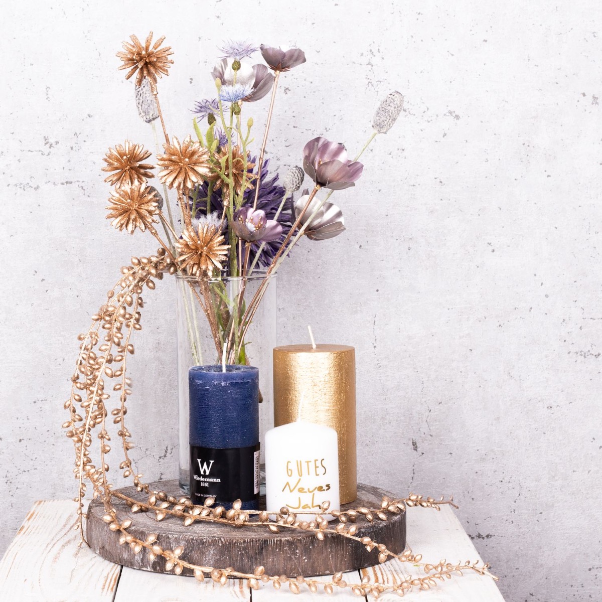 Conseil d'aménagement : Raccourcir les fleurs à la taille du vase et les mettre dans le vase. La suspension dorée de senecio doit bien serpenter vers le bas et entourer les bougies. Placer les bougies de manière à ce que la flamme ne soit pas trop proche des fleurs artificielles.