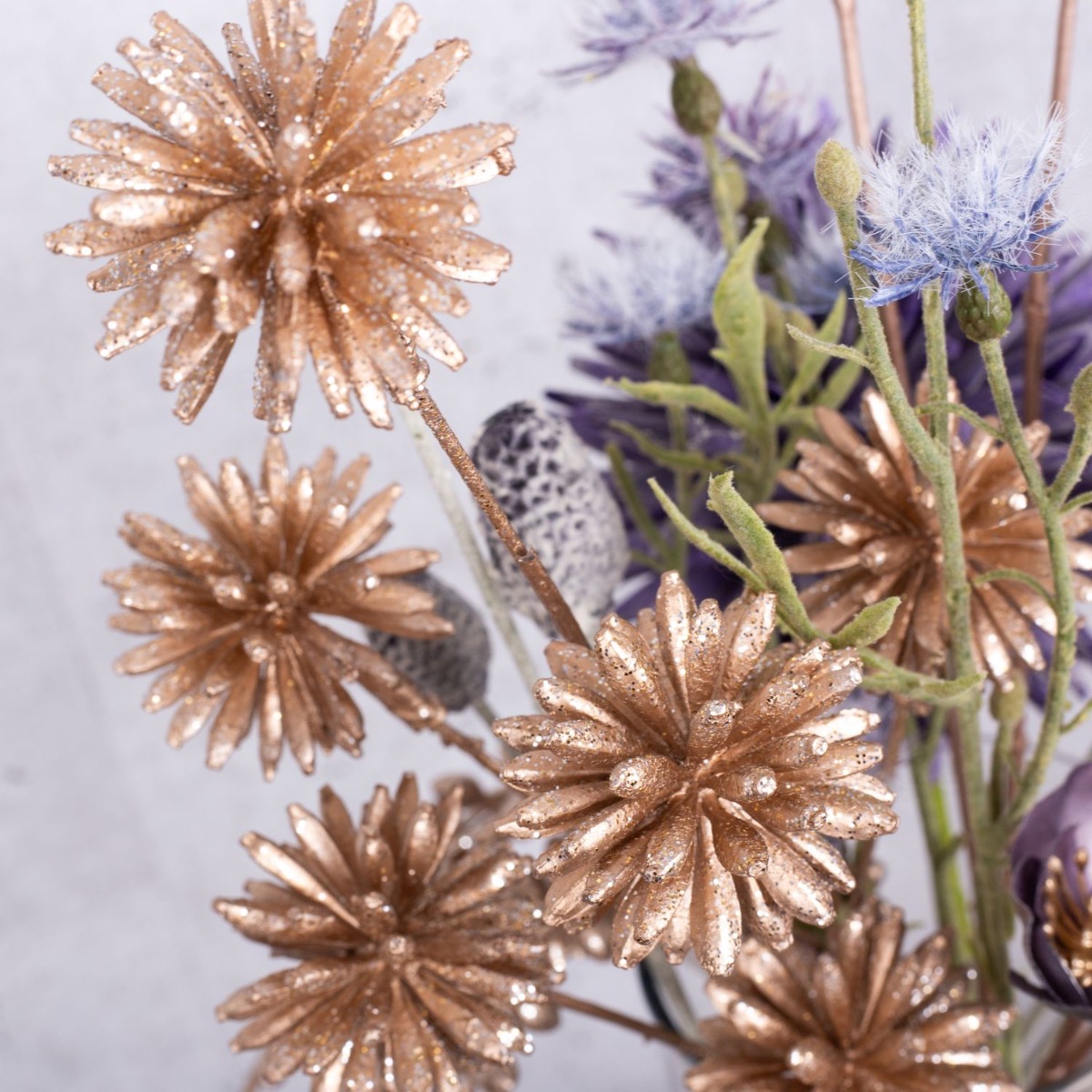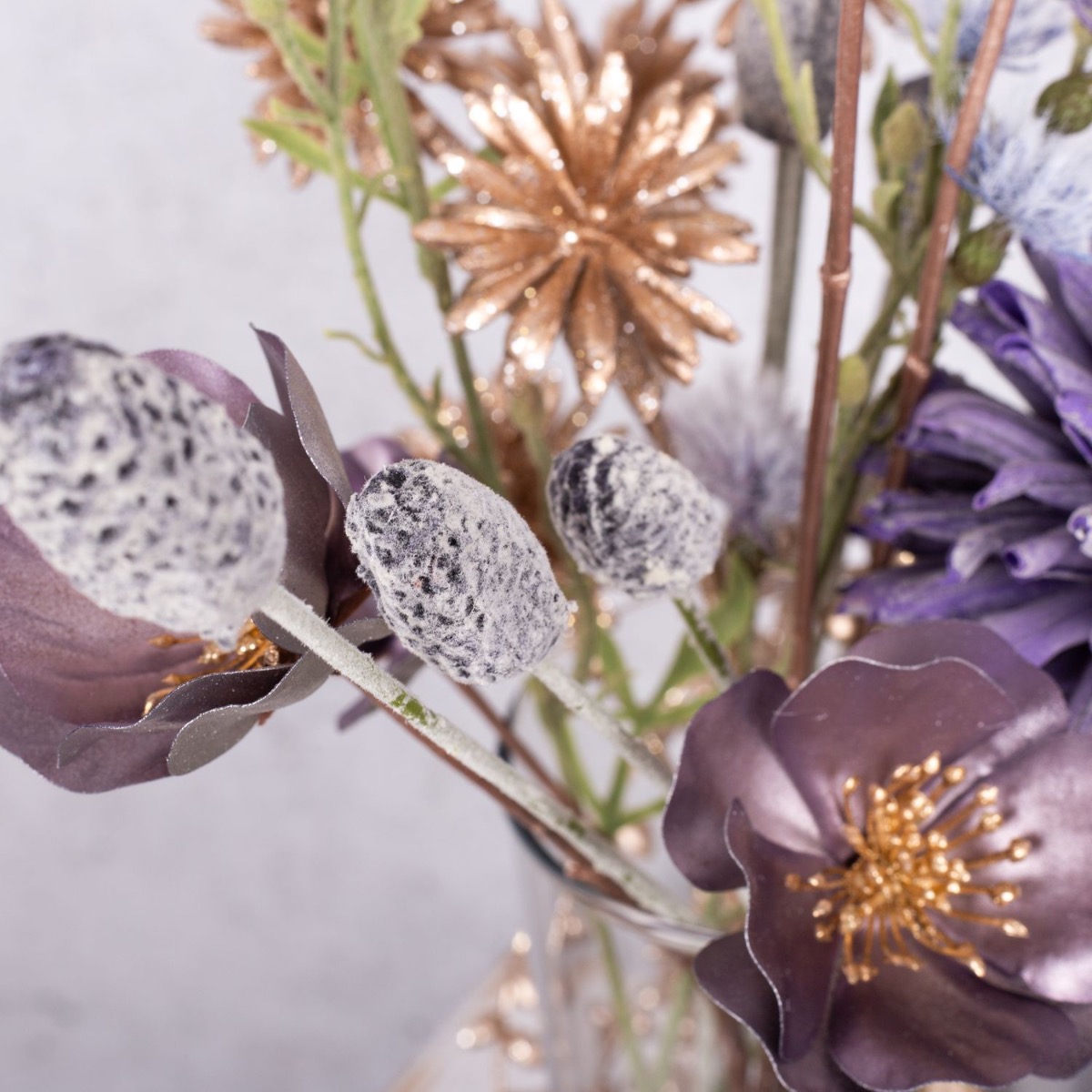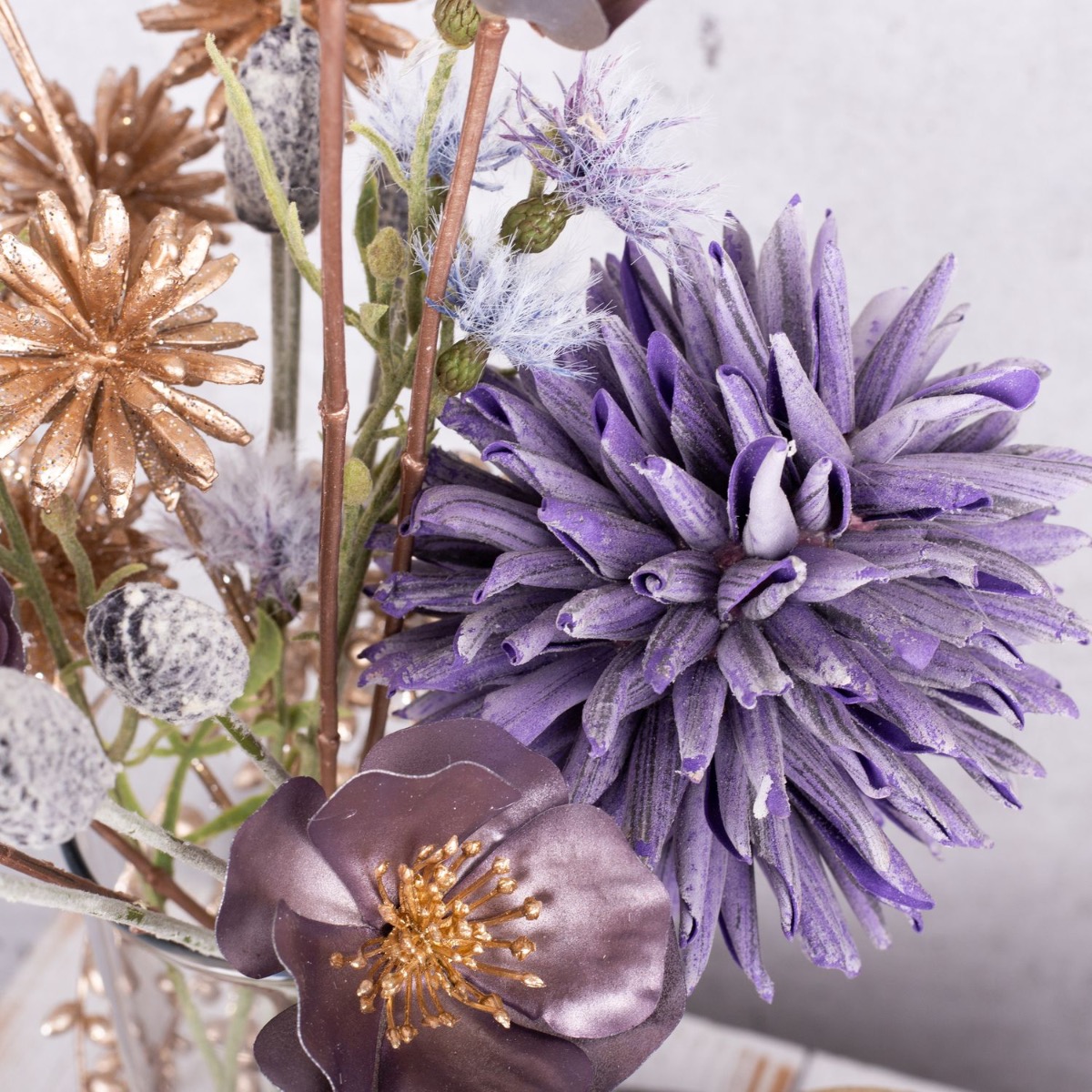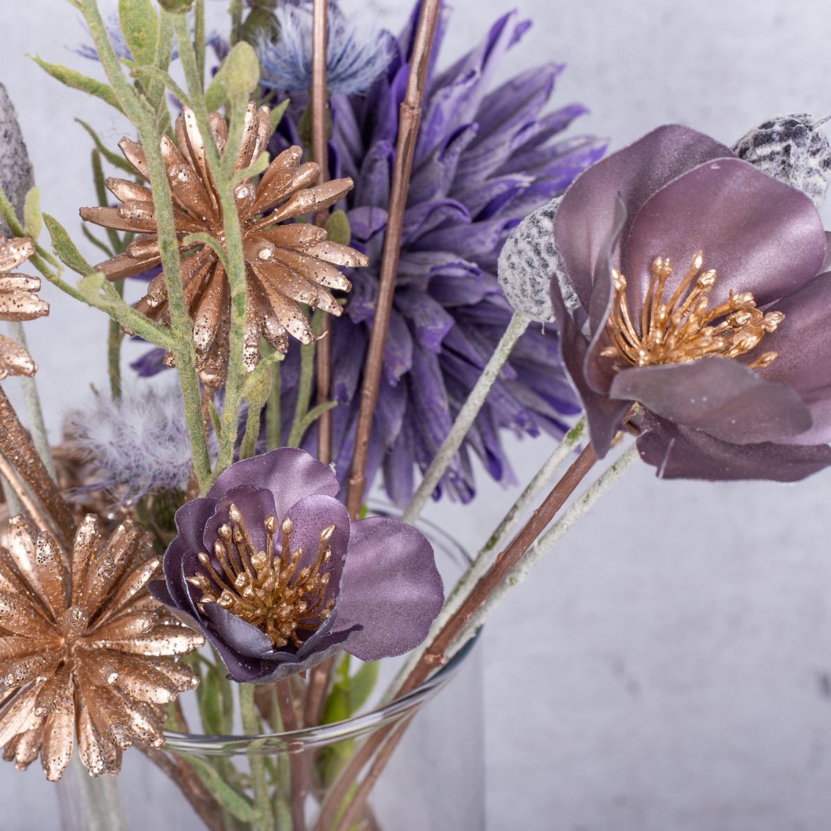 Un feu d'artifice d'or et de lilas ! Un petit bouquet de fleurs argentées et dorées, juste assez haut pour que l'on puisse encore bavarder avec son interlocuteur, constitue la décoration de table parfaite pour une fête de Nouvel An. Différentes bougies dont la couleur s'harmonise avec le bouquet font partie de toute bonne fête de la Saint-Sylvestre. Des bleuets dorés et des roses de Noël argentées et violettes scintillent merveilleusement à la lumière des bougies. Ça met tout de suite de bonne humeur. Shop the look!