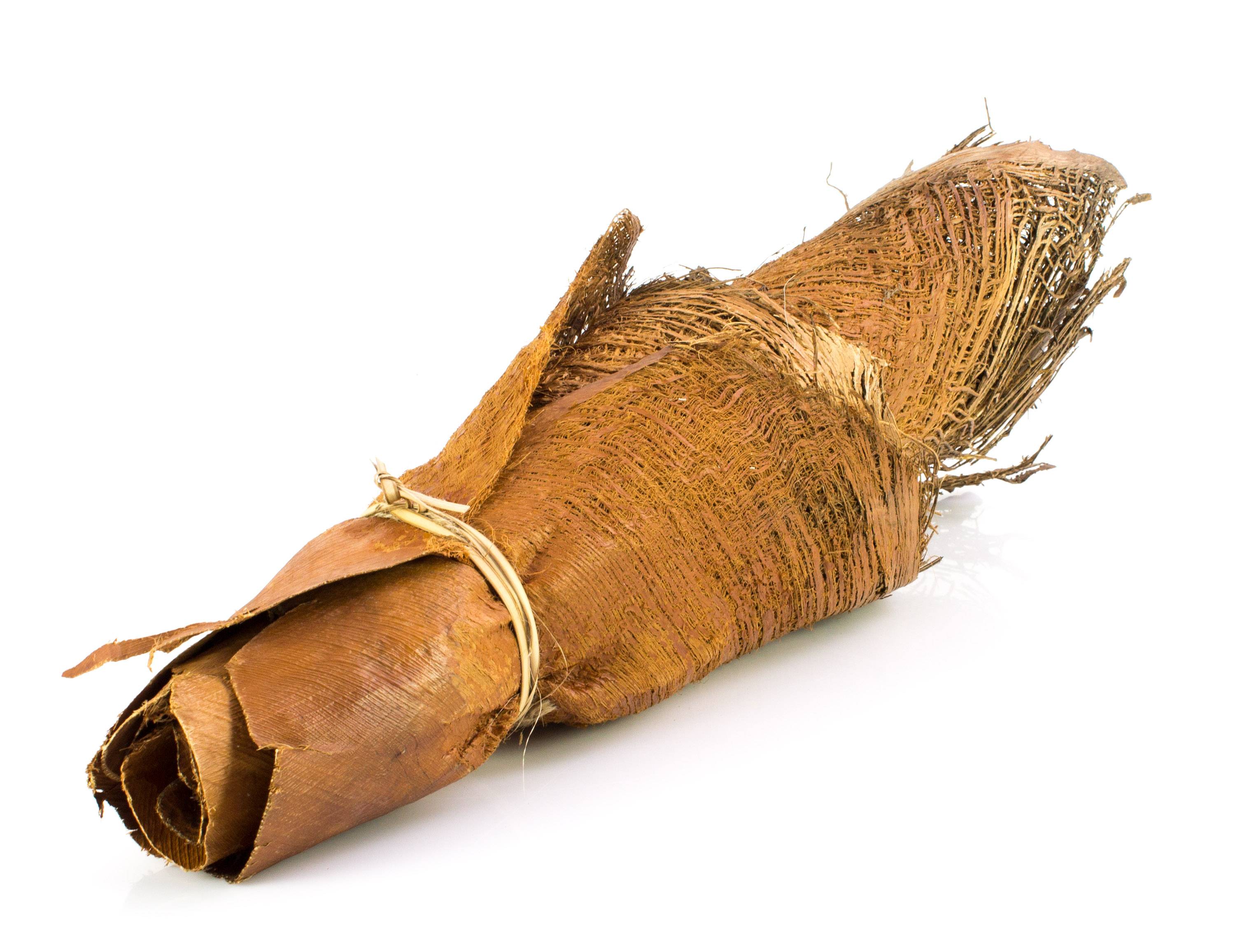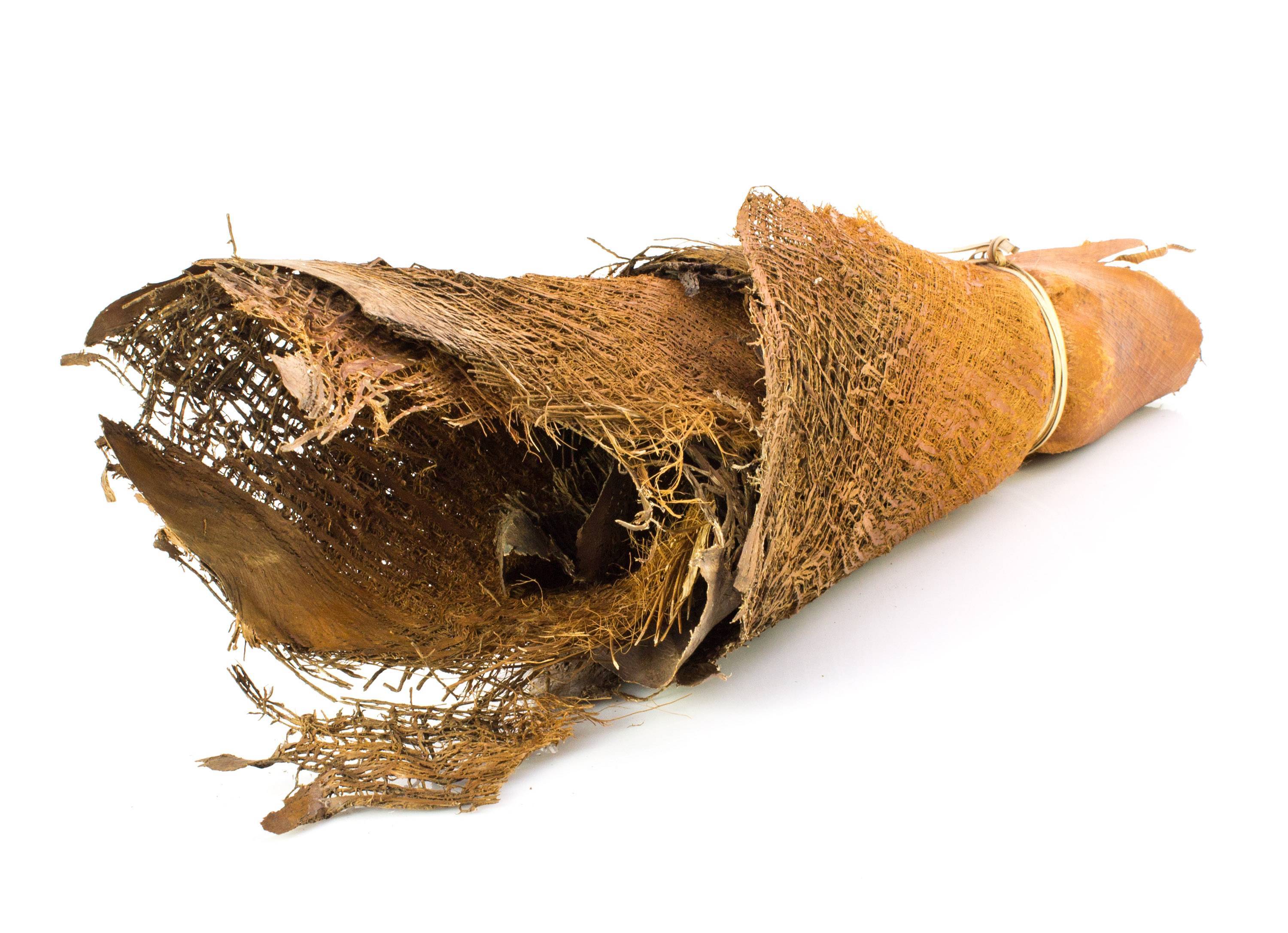 Morceaux de palmier séchés de dimensions diverses d'environ 15 x 15 cm à 30 x 40 cm. La fibre d'écorce beige-marron peut faire office de support naturel si on l'enroule pour former un tronc.