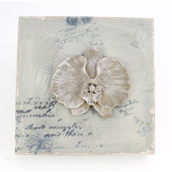 - Fond en bois décoratif gris enduit avec une grande orchidée de couleur grise clair, des lettrages et peintures de couleur bleu fonce, la fleur est solidement fixée ce qui donne un effet 3D