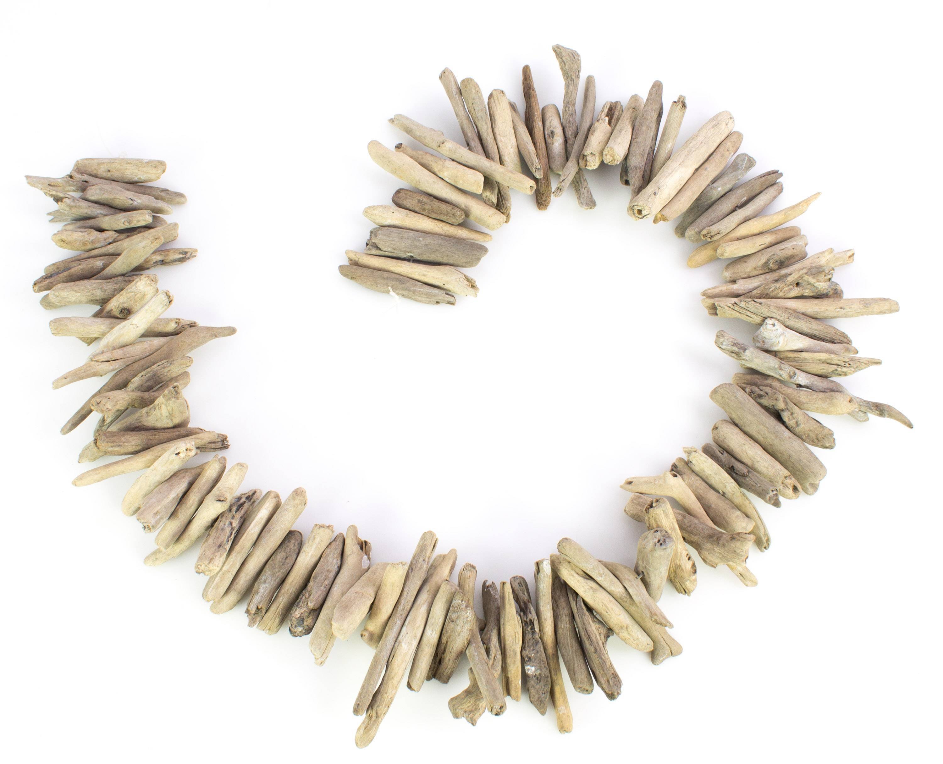 Morceaux de bois flotté séché attachés les uns aux autres d'une longueur totale d'environ 105 cm. Le bois a été légèrement blanchi, c'est un élément décoratif original et moderne.