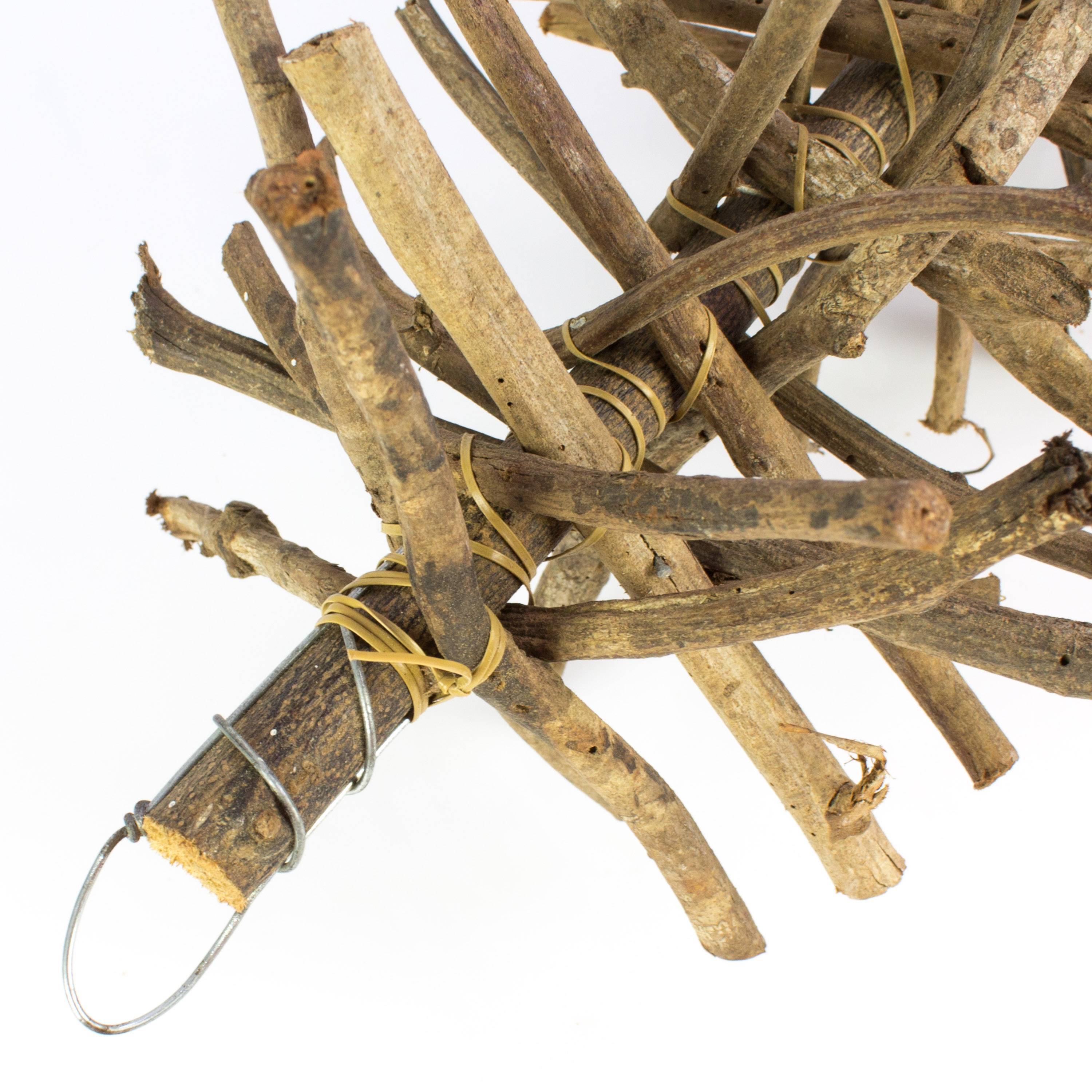 - Le bois décoratif a une longueur totale d'environ 35 cm et un diamètre d'environ 15 cm, environ 40 morceaux de bois fermement attachés à la tige centrale avec un fil, à suspendre à l'aide d'un fil métallique solide.