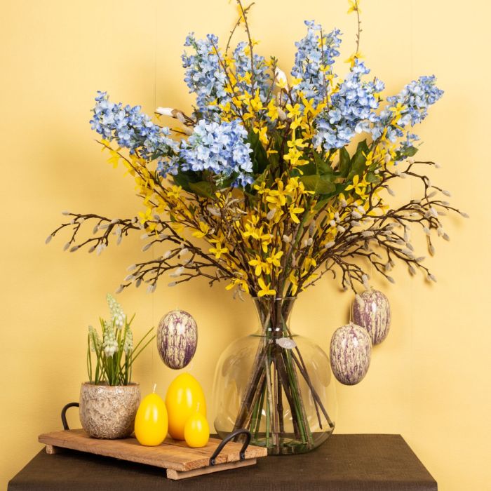Simple et naturel! Le long hiver est enfin terminé et les premiers rayons de soleil font apparaître les premières fleurs dans la nature. Enfin, la chaleur revient ! Les magnolias et les branches de bouleau semblent avoir été cueillis et sont parfaits pour y accrocher quelques œufs de Pâques. Il est vraiment rare de voir des jacinthes blanches dans la nature. Ici, elles se marient particulièrement bien avec les bourgeons blancs et duveteux du magnolia. Nous avons complété ce look avec 5 branches de forsythia jaunes et du lilas bleu. La chasse aux œufs de Pâques peut commencer ! Shop the Look!