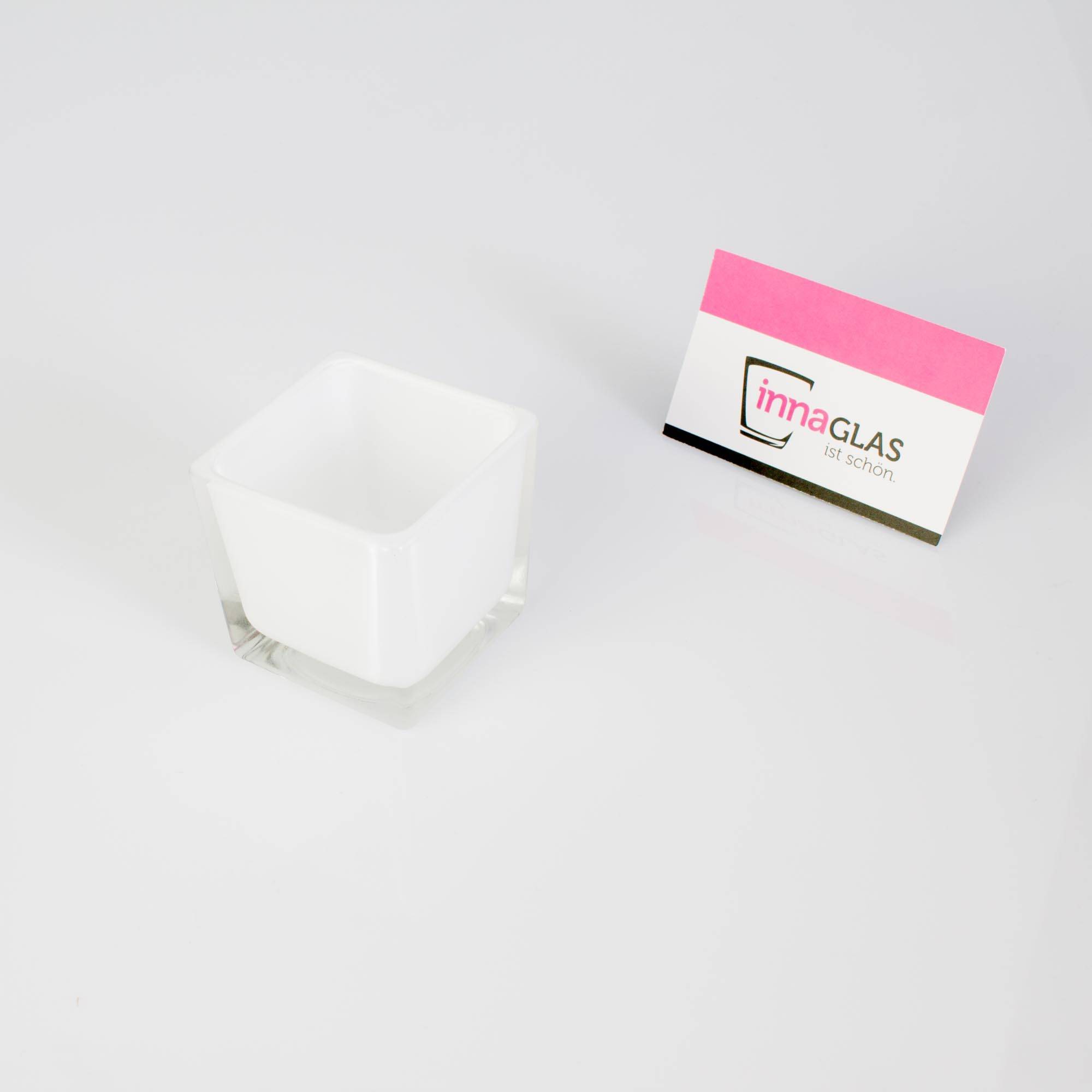 Petit photophore carré en verre KIM EARTH mesurant 6 x 6 x 6 cm. Ce petit bougeoir INNA Glas sera parfait pour vos bougies chauffe-plat.