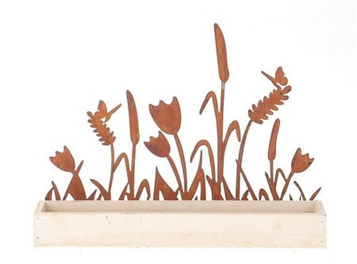 Plateau en bois HIFTU avec 6 bouteilles en verre, fleurs en zinc, rouille, 35x6x28,5cm