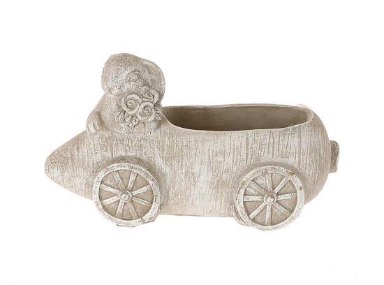 Pot à plantes Voiture RIANAS avec lièvre, ciment, décoration de Pâques, gris-blanc, 22x12x12,5cm