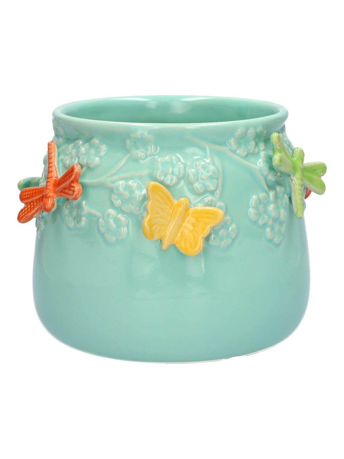 Pot de fleur KIMANA en céramique, papillons libellules en 3D, bleu-orange-jaune-vert, 11cm, Ø13,5cm