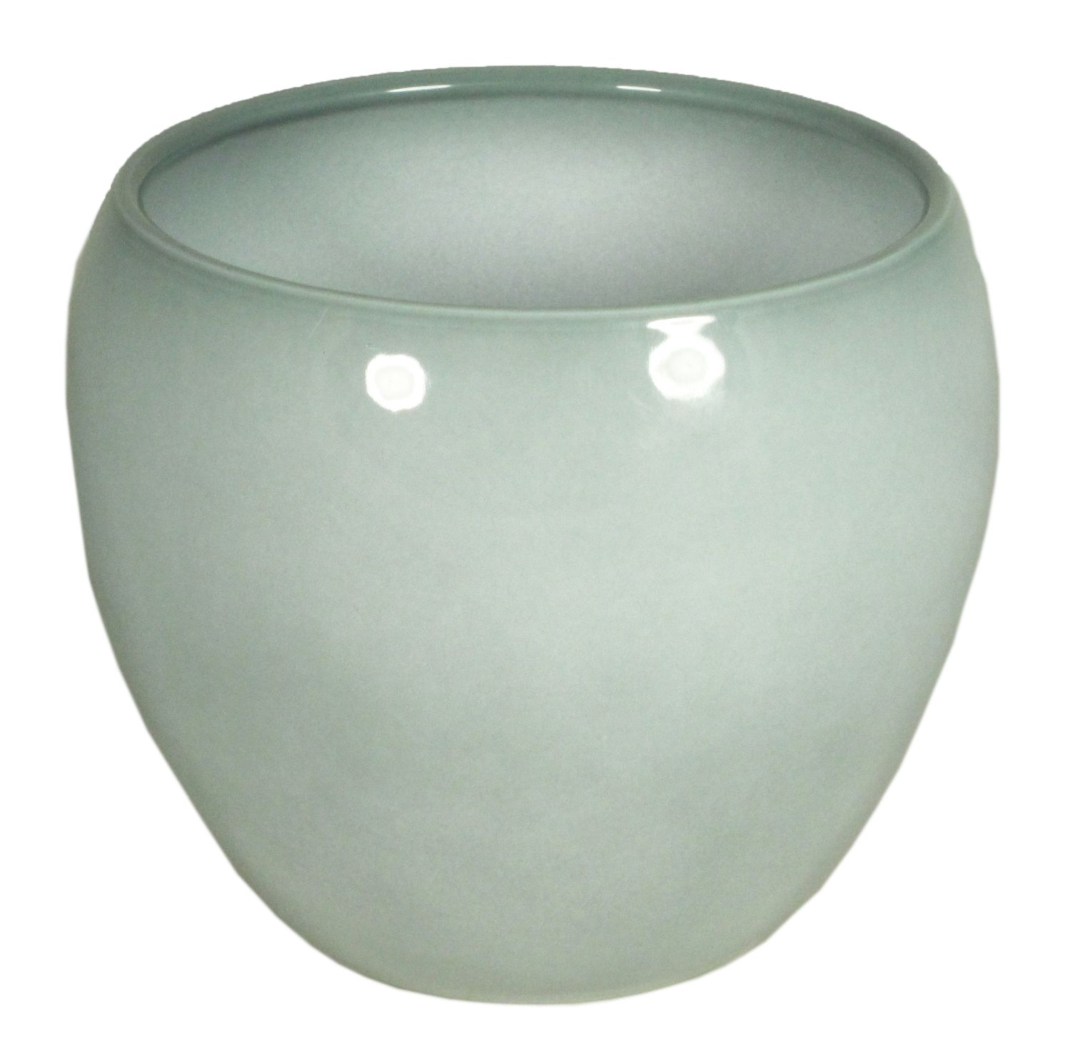Cache-pot URMIA BASAR en céramique de couleur gris-vert avec un diamètre d'environ 14 cm et une hauteur d'environ 11,5 cm.