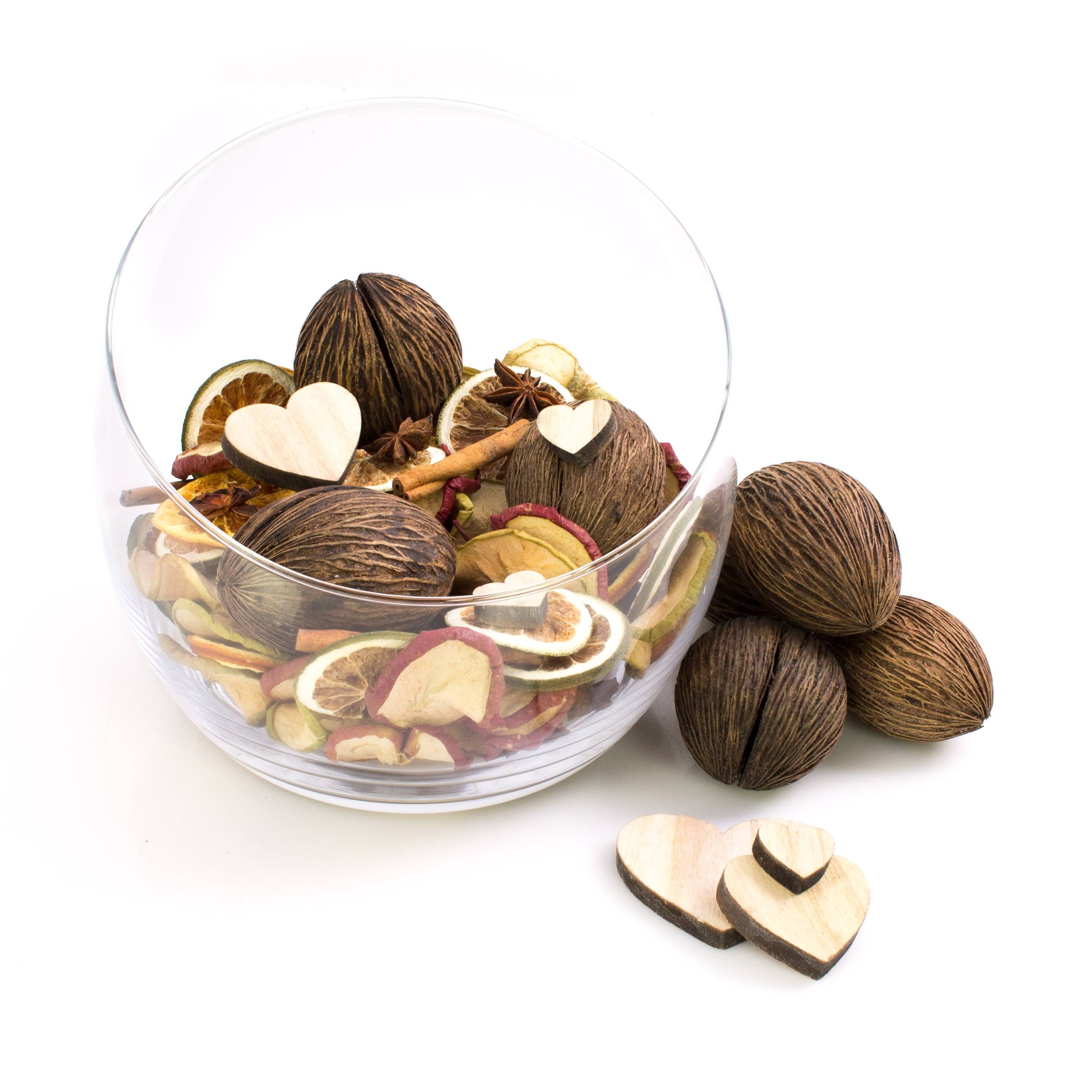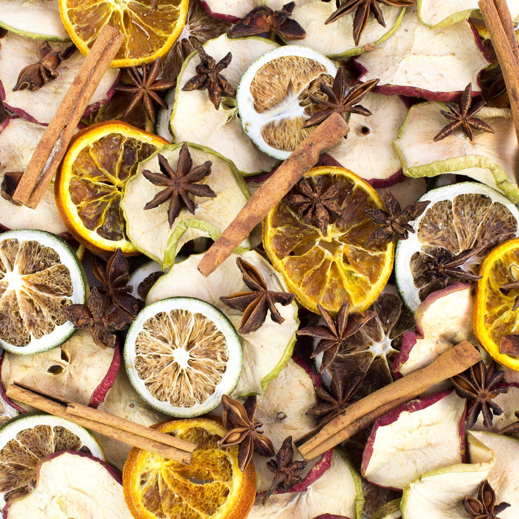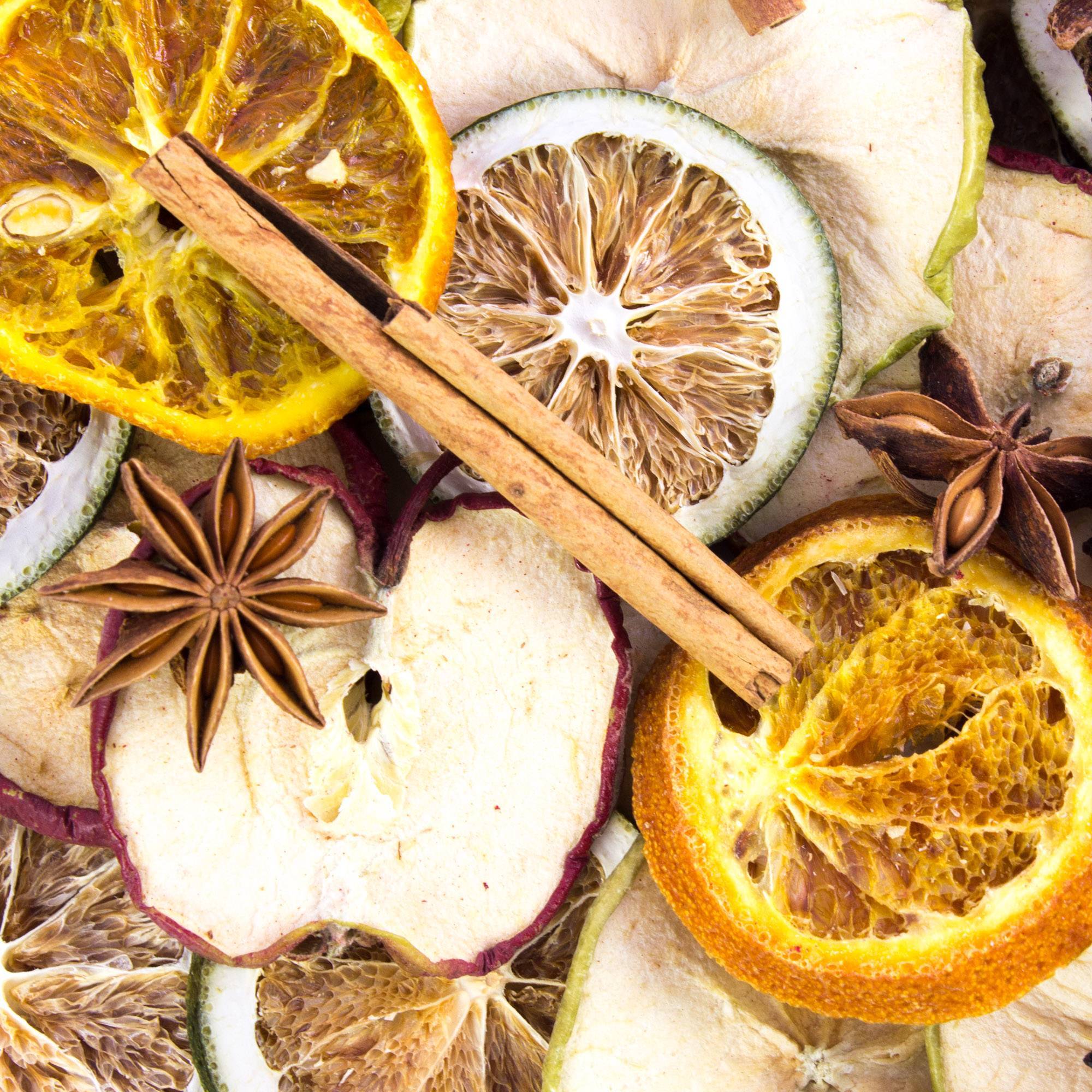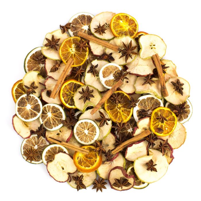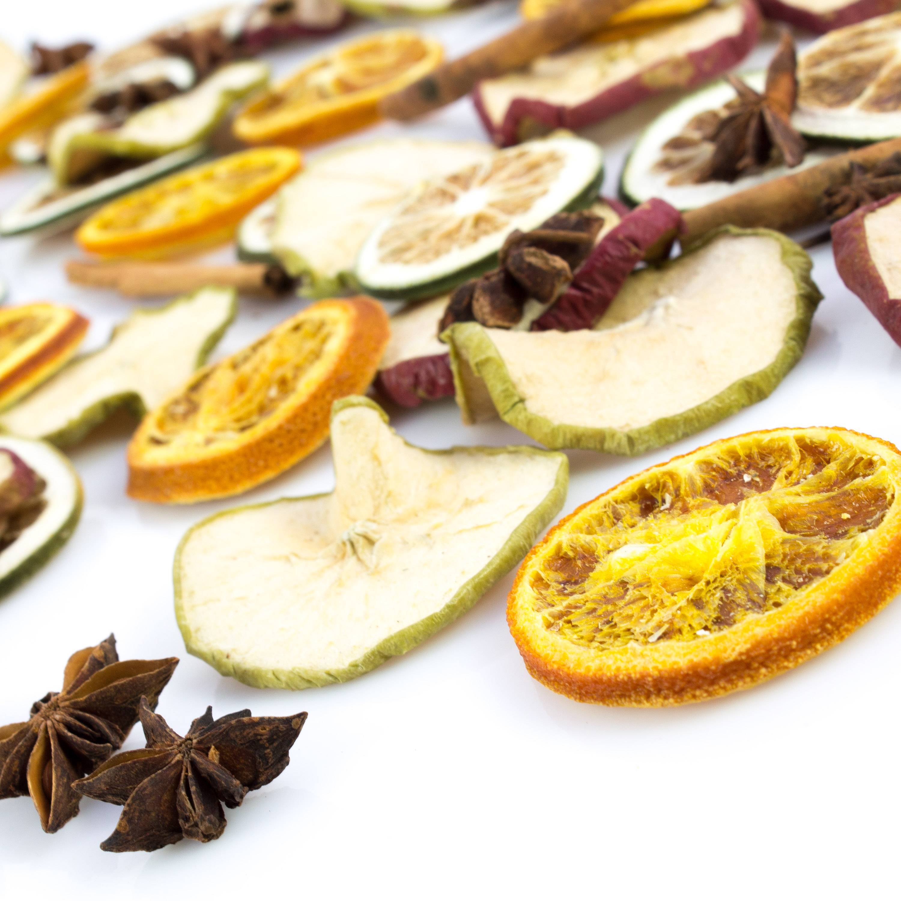 - Les morceaux de fruits secs (orange, citron vert, pommes diverses) ont un diamètre d'environ 4-6 cm