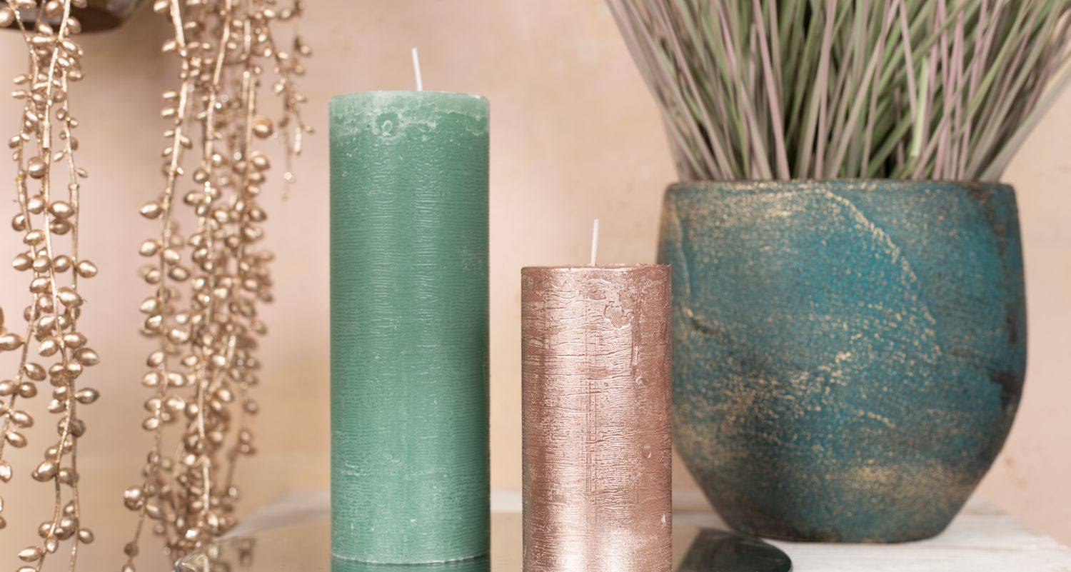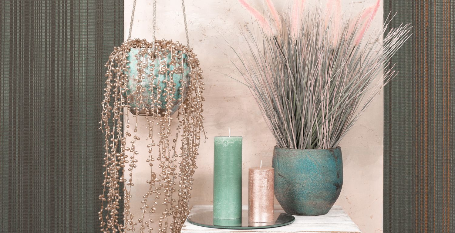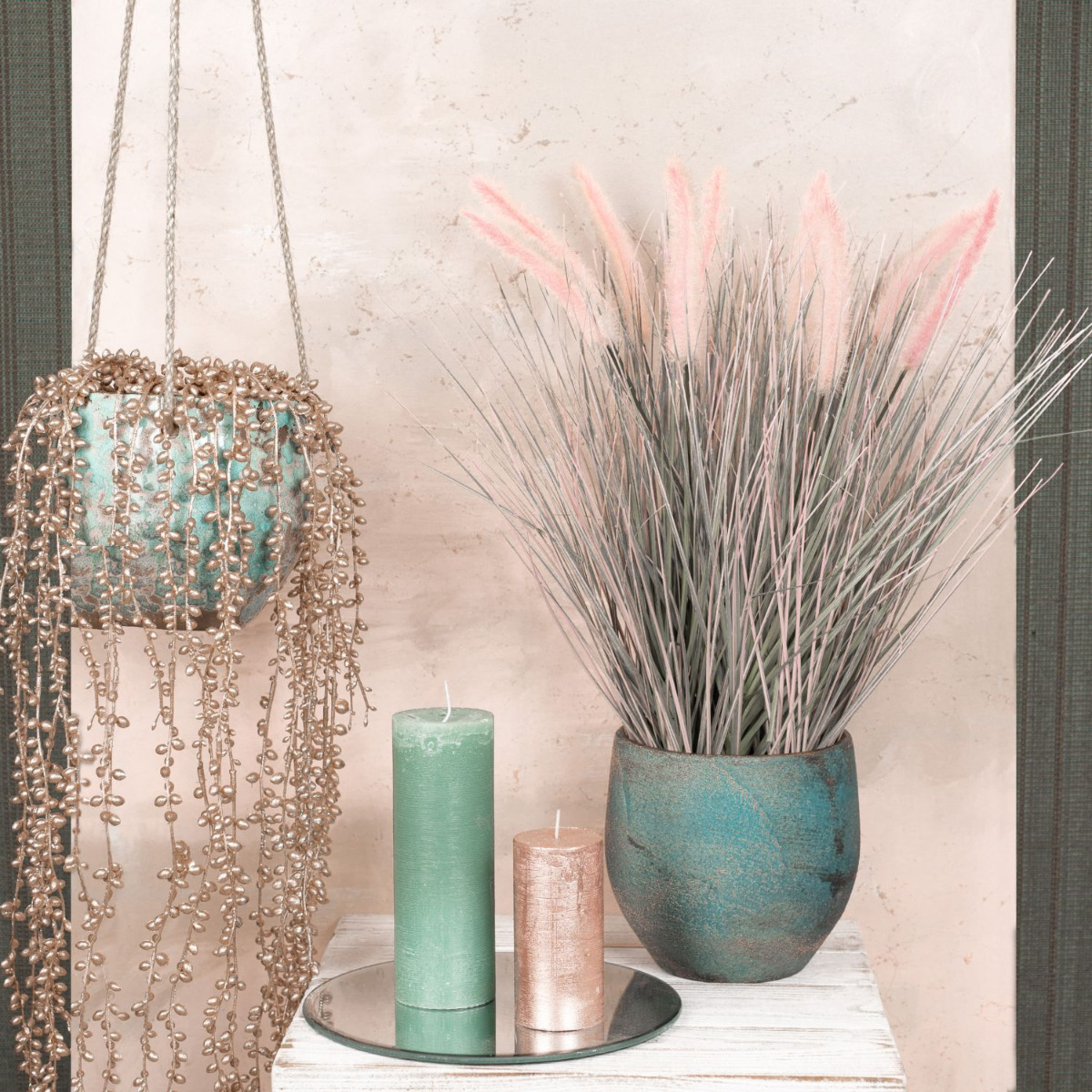 Des plantes artificielles aux couleurs extravagantes! Une jolie composition de plantes artificielles aux couleurs assorties, de pots en céramique et de bougies. La plante de pois artificielle pend élégamment du panier suspendu et étaye l'herbe aux écouvillons (pennisetum) en forme de fontaine avec des panicules roses duveteuses. Les bougies brillantes de couleur or rose et vert menthe qui se reflètent dans le miroir créent une atmosphère chaleureuse. Vous aussi, vous aimeriez donner un nouvel éclat à votre intérieur ? Shop the Look!
