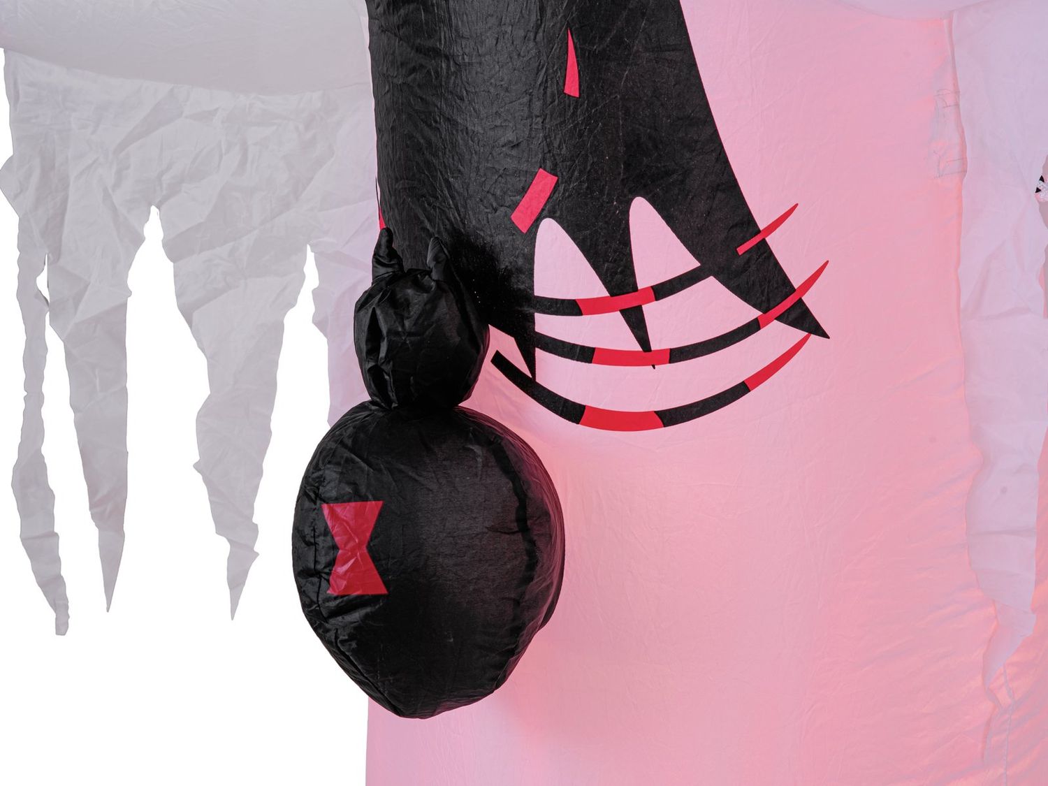 - Pour le fonctionnement, le fantôme est raccordé en permanence à l'alimentation électrique par un câble de 2 mètres de long, il se gonfle alors seul jusqu'à sa taille maximale, des piquets pour le sol et des cordes d'ancrage sont également fournis pour une stabilité accrue, après la saison, l'air est simplement dégonflé et la figurine peut être repliée pour gagner de la place