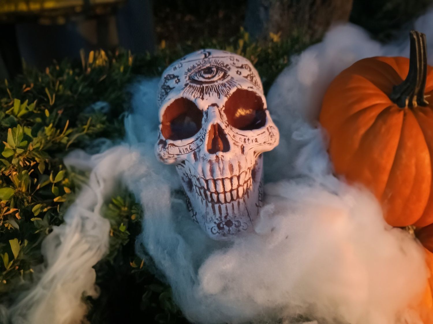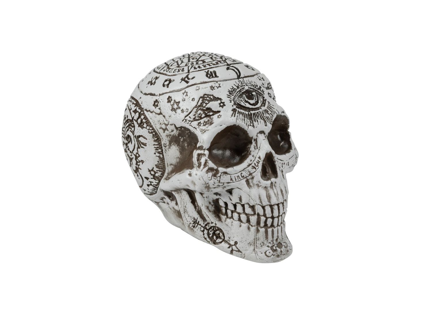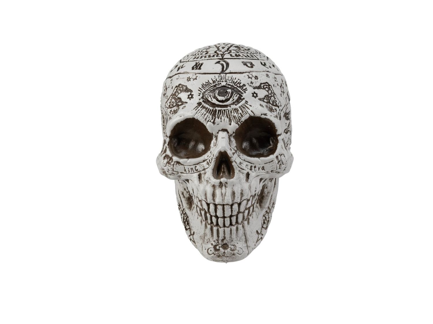 Tête de mort d'Halloween FARALDA avec des signes et symboles mystiques, blanc-noir, 12x10x18cm