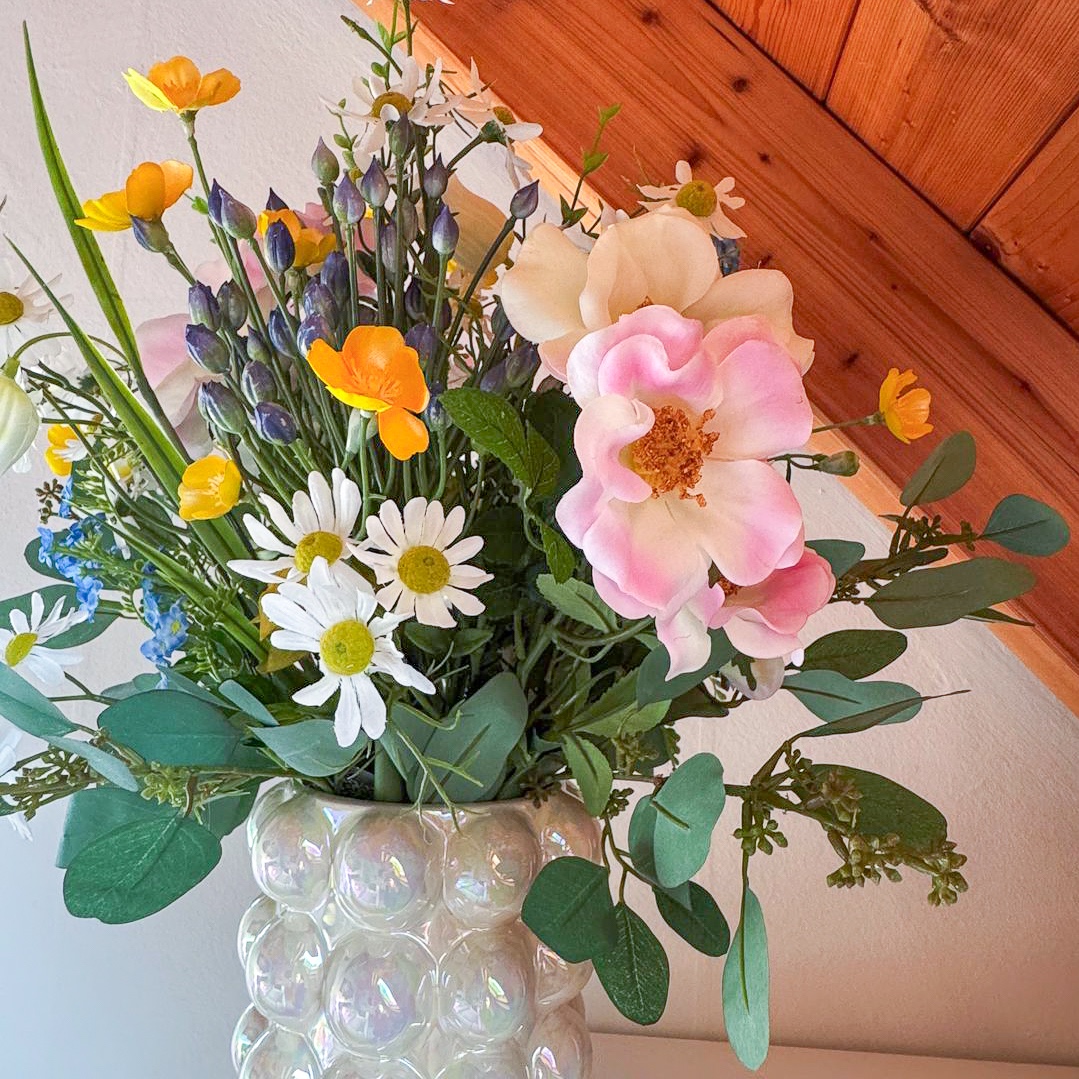 Une touche estivale qui apporte calme et beauté à chaque pièce ! Ce bouquet artificiel apporte l'élégance décontractée d'une chaude journée d'été directement dans votre intérieur, sans le caractère éphémère des fleurs naturelles. Les roses sauvages roses confèrent à l'ensemble une atmosphère douce, tandis que la camomille qui les entoure crée une sensation de calme naturel. Les campanules blanches s'étirent délicatement et confèrent au bouquet une note claire, presque minimaliste, qui est agréablement adoucie par le jaune délicat des boutons d'or. Une touche de modernité est ajoutée par les bourgeons d'ail décoratif bleu, dont la forme claire donne de la structure au bouquet. De délicates fleurs de myosotis se nichent entre elles et apportent une touche de couleur légère et discrète. Le tout est encadré par des branches d'eucalyptus et de troène, qui confèrent au bouquet une silhouette calme et équilibrée, parfaite pour tous ceux qui aiment le look naturel, mais souhaitent renoncer aux fleurs véritables. Shop the Look!