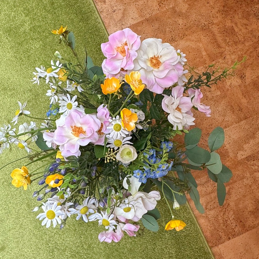 Exemple d'utilisation : ce bouquet trouve parfaitement sa place sur un buffet, un bureau ou une table à manger, sans pour autant dominer la pièce. Dans un joli vase en céramique, il s'intègre facilement dans les styles d'intérieur scandinaves, modernes ou même rustiques. Que ce soit dans le salon comme touche de couleur apaisante, dans le couloir comme accueil chaleureux ou dans le bureau à domicile comme accroche-regard discret, il crée une atmosphère agréable qui dure longtemps.